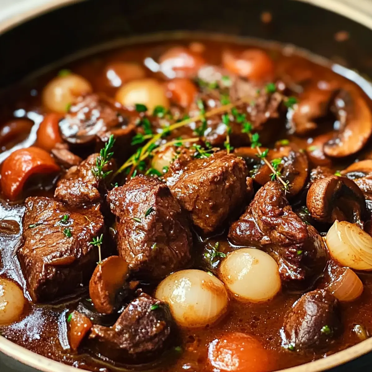 While the stew is braising, sauté pearl onions and mushrooms in a separate skillet over medium heat until they’re golden and tender, about 5-7 minutes. After the braising time is complete, stir the sautéed onions and mushrooms into the Beef Bourguignon and allow it to rest for 10 minutes before serving.