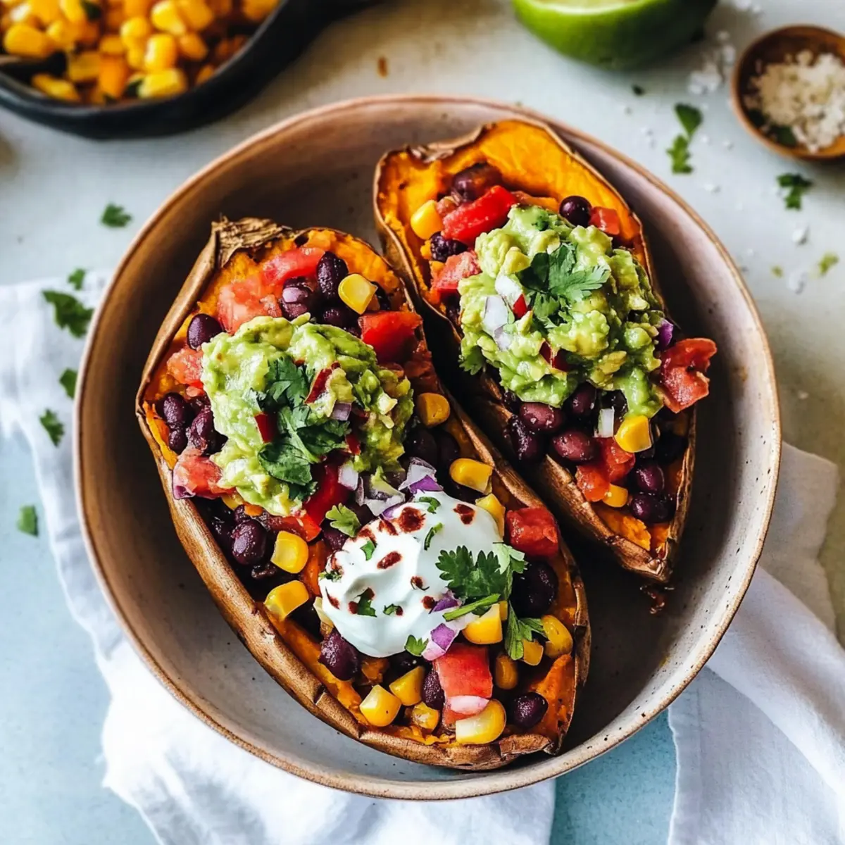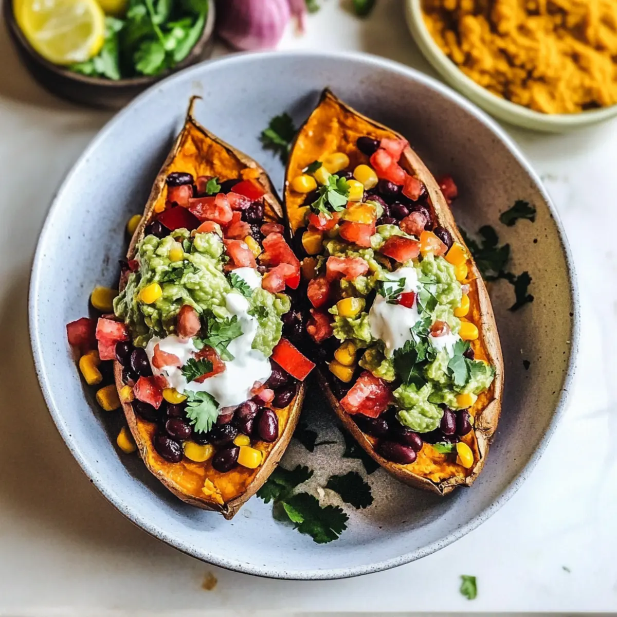 Absolutely! For freezing, it’s best to do so without the guacamole and vegan sour cream. Place the stuffed sweet potatoes in a freezer-safe container or wrap them tightly in foil or plastic wrap. They can be frozen for up to 3 months. When ready to eat, thaw overnight in the refrigerator and reheat in your oven at 350°F (175°C) for about 20-25 minutes, or microwave until warmed through.