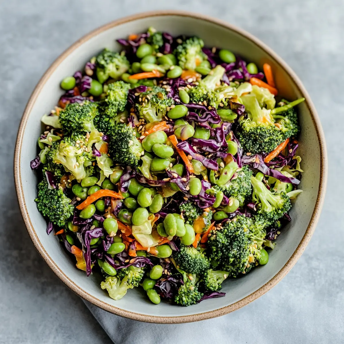 In the same large bowl, add the shelled edamame to your chopped broccoli and shredded cabbage. This combination not only boosts the salad’s nutritional value but also adds a pleasing creamy texture. Gently toss the ingredients together using a large spoon, ensuring an even distribution of colors and textures throughout your crunchy broccoli salad.