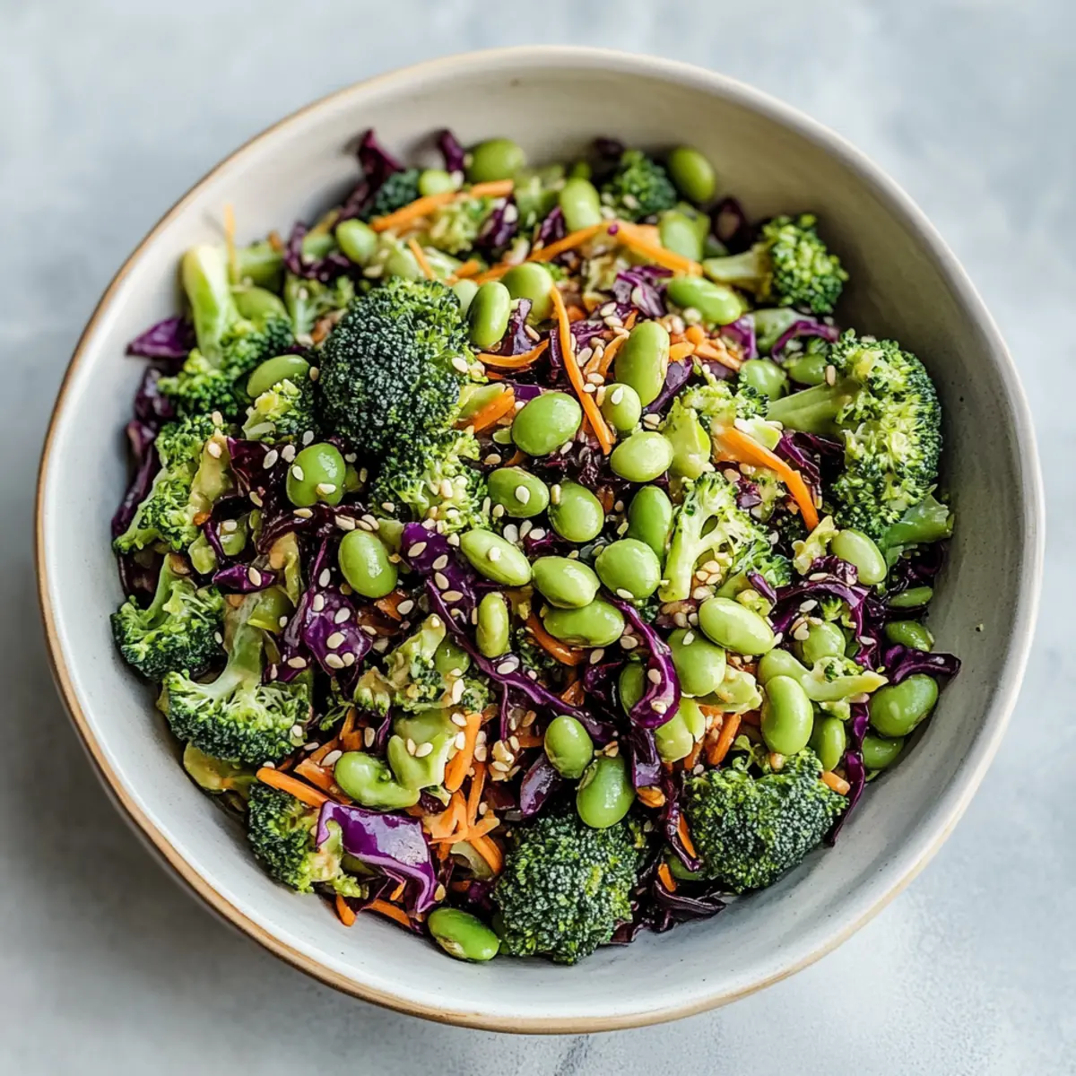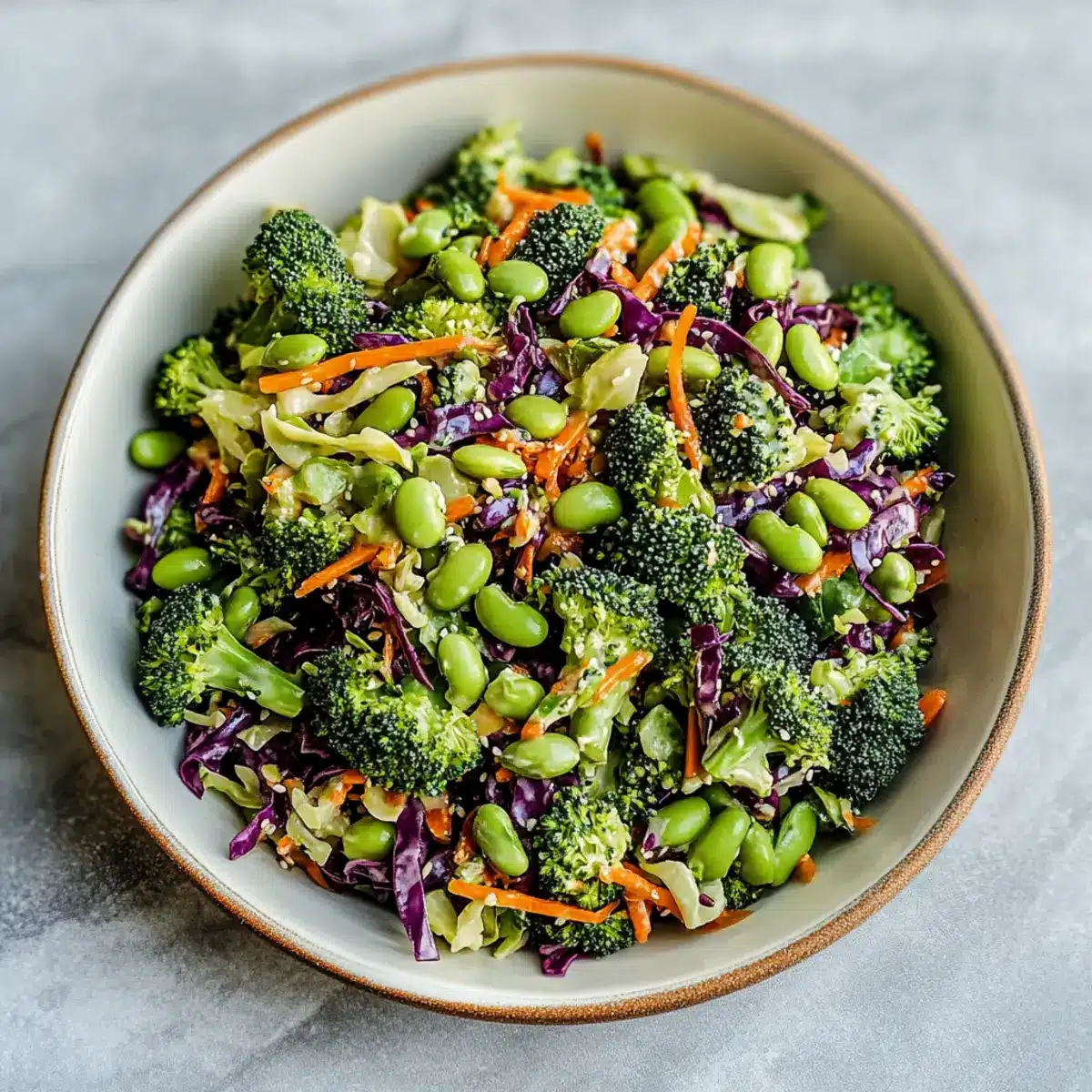 - Add shelled edamame to the bowl with broccoli and cabbage. Gently toss using a large spoon.