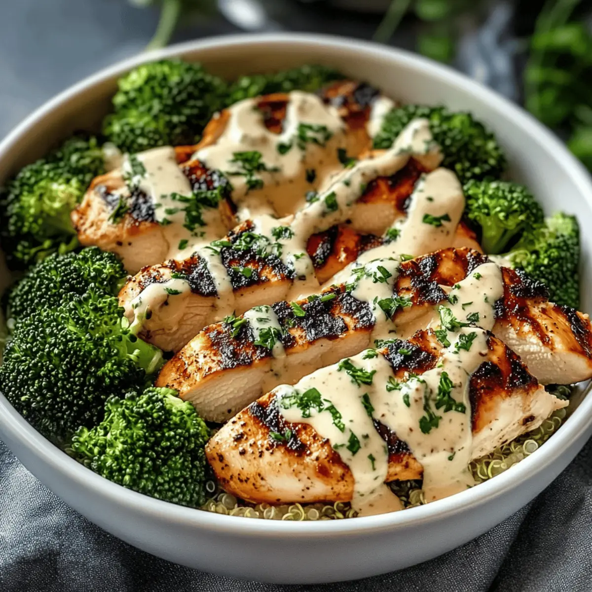 Grilled Chicken & Broccoli Bowls with Creamy Garlic Sauce Delight