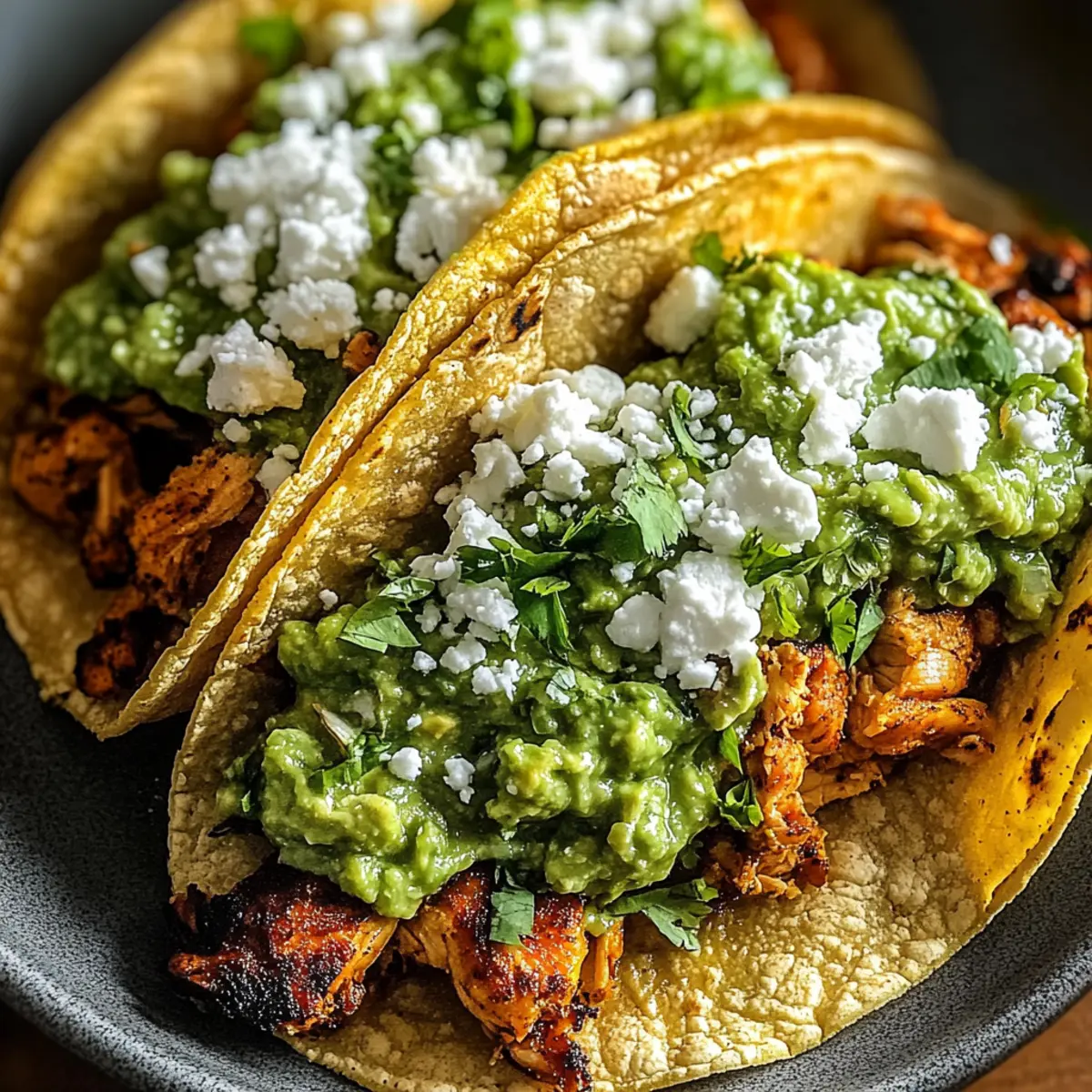 Now comes the fun part—assembling your tacos! Start by placing sliced or shredded pieces of the cooked chicken on each warm tortilla. Spoon a generous amount of the freshly made guacamole on top, followed by a sprinkling of crumbled queso fresco or cotija cheese. Each taco should be bursting with flavor and ready to enjoy with your loved ones.
