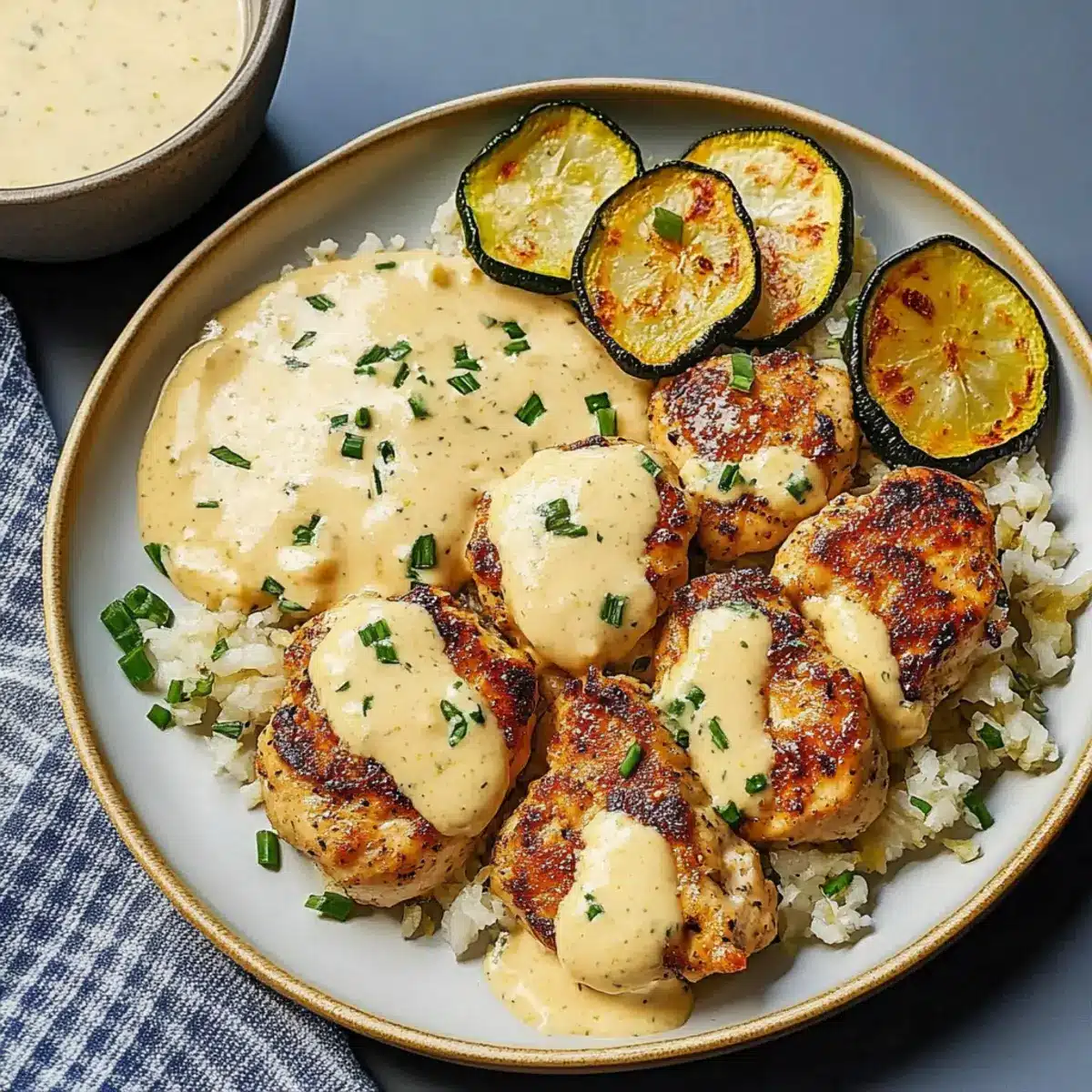Once the couscous is ready, fluff it with a fork and stir in the green parts of the scallions and lemon zest for a refreshing touch. On each plate, serve a portion of the creamy lemon butter chicken drizzled with the luscious sauce alongside the crispy zucchini rounds, creating a delightful presentation for your Creamy Lemon Butter Chicken with Crispy Zucchini Delight.