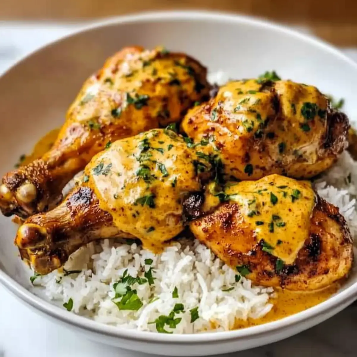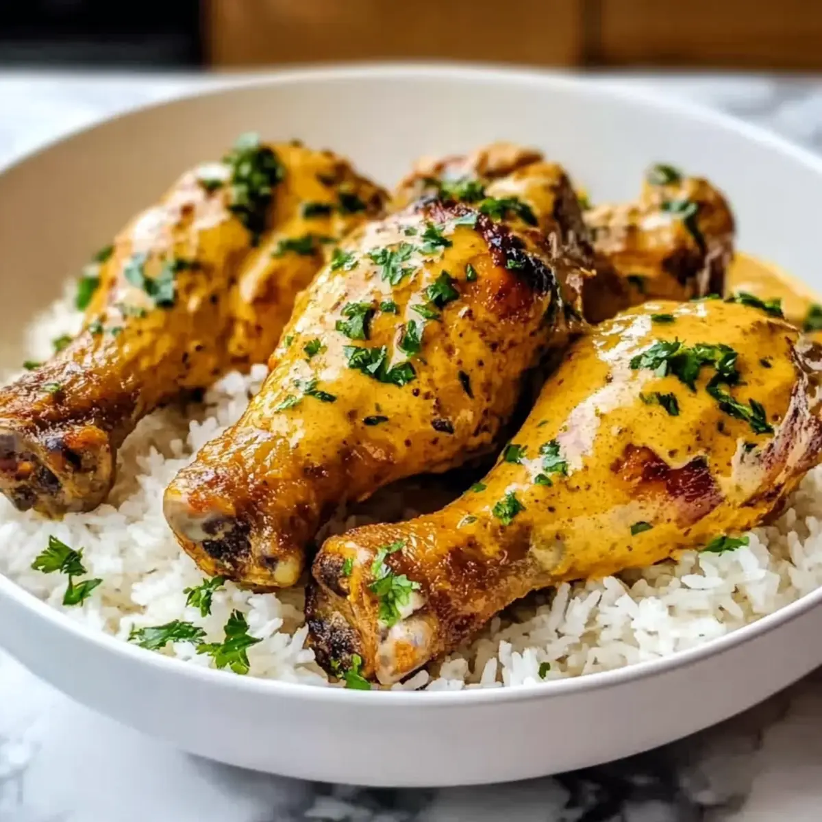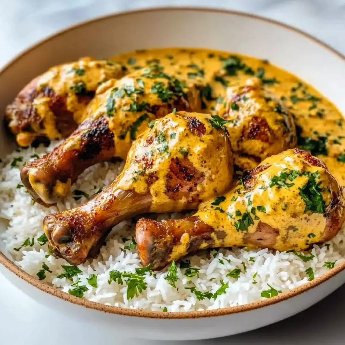 - Serve the chicken drumsticks over the steamed rice, drizzled with extra creamy sauce.