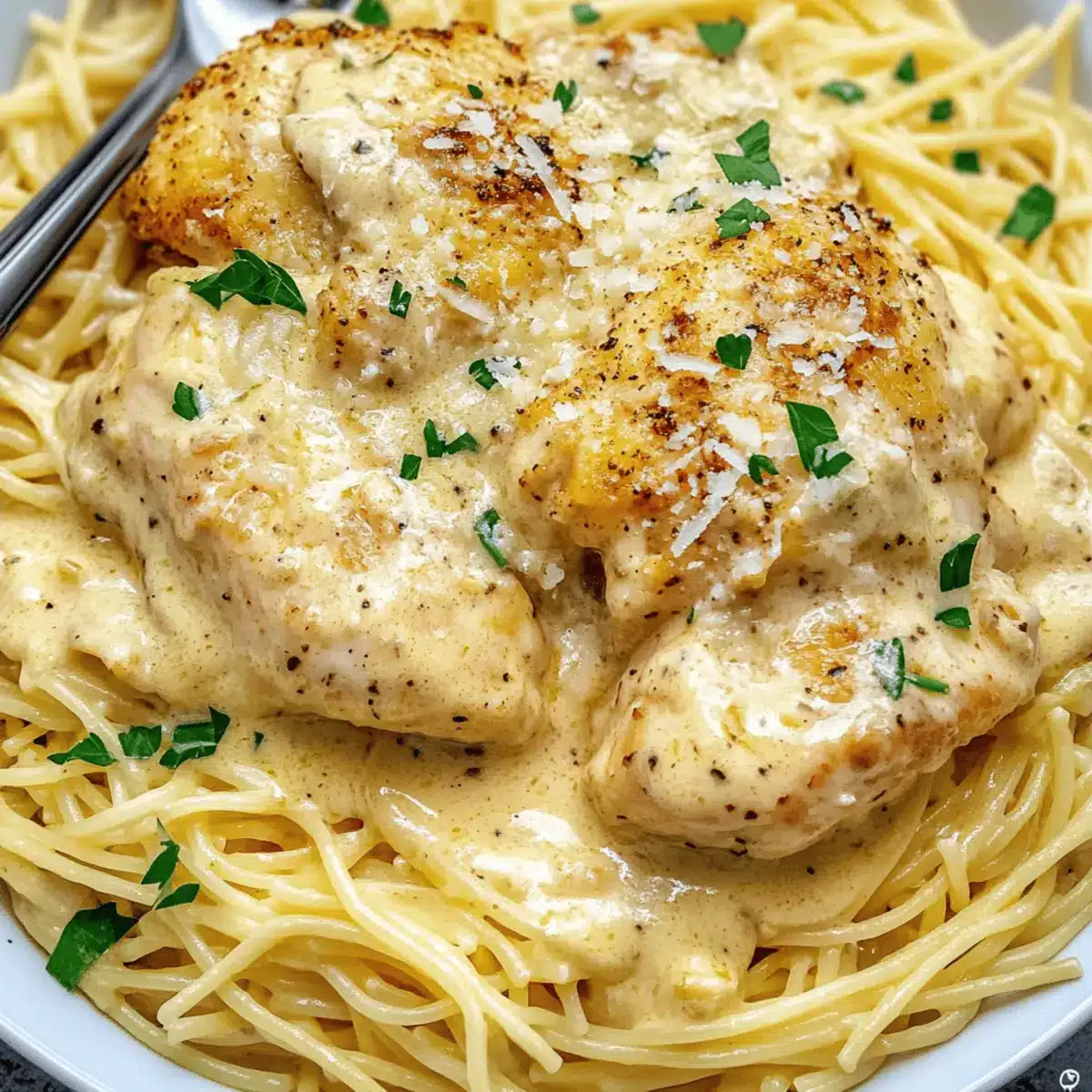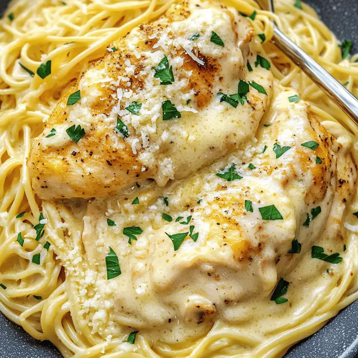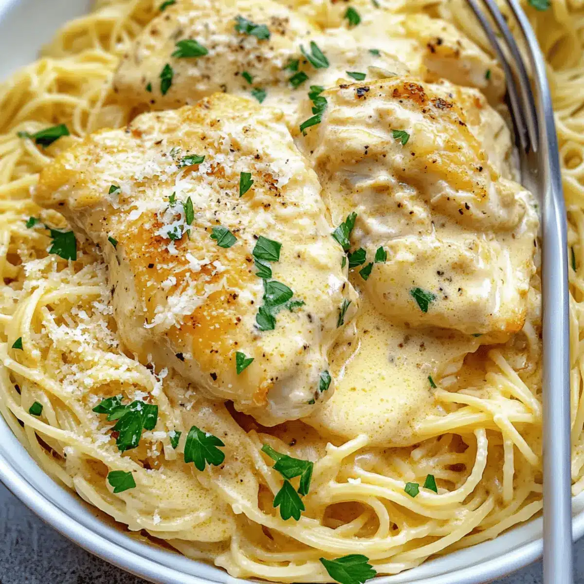 - To serve, keep the chicken breasts whole or shred them over the pasta. Ladle the creamy sauce generously on top. Garnish with parsley, cracked pepper, and Parmesan cheese.