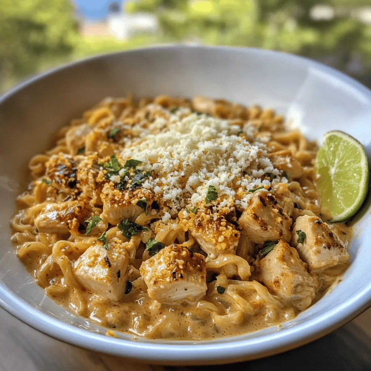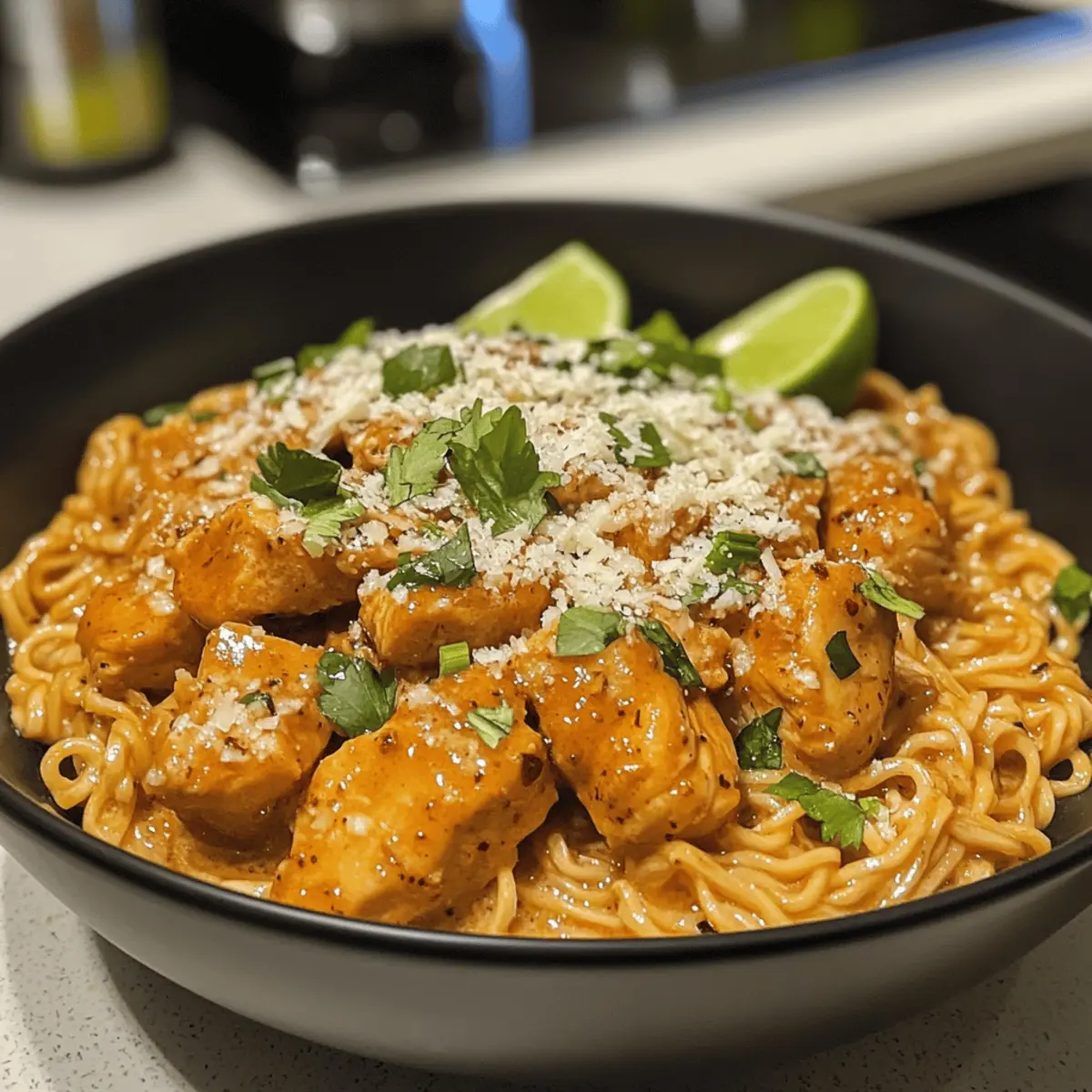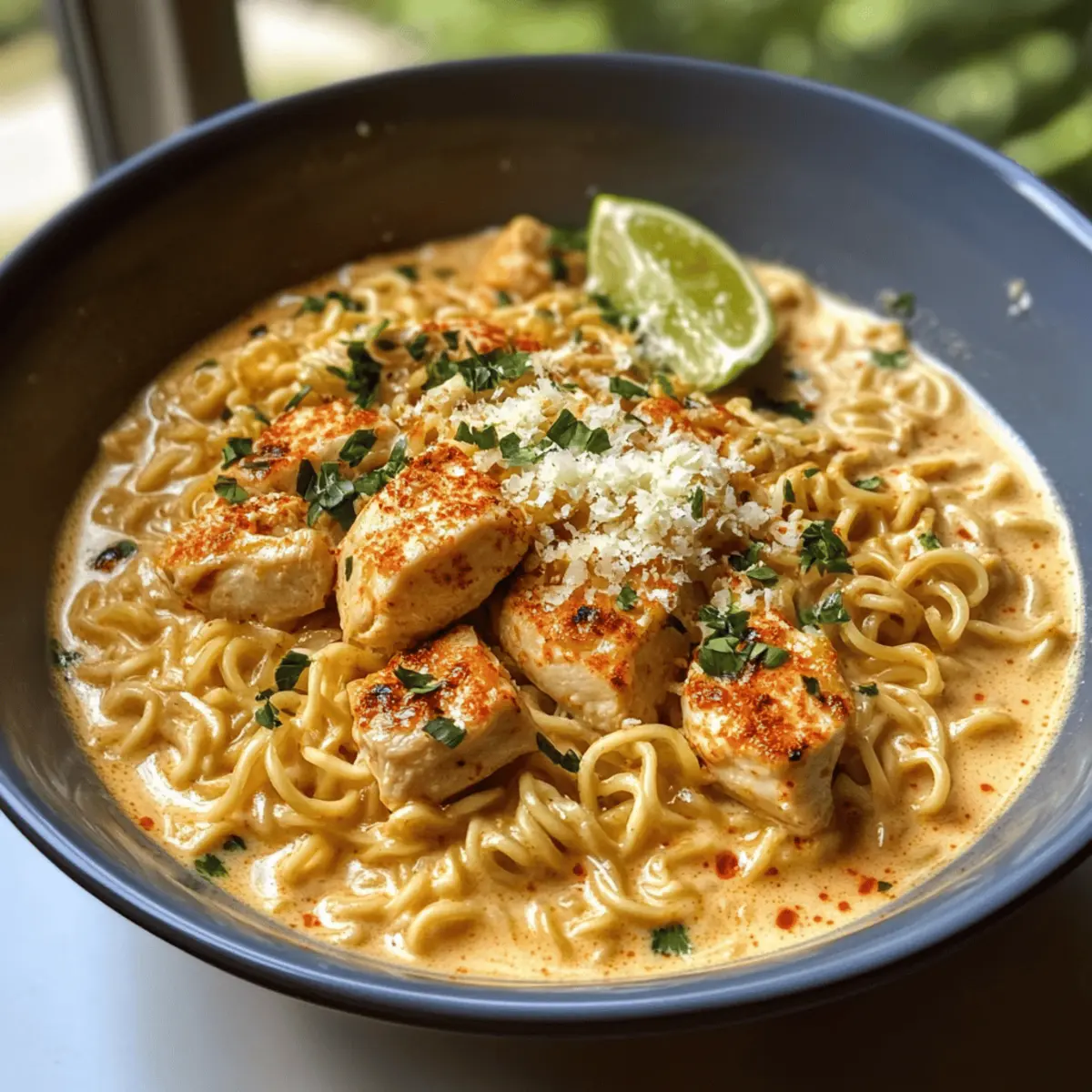 - To serve, divide the creamy chicken ramen into bowls, topping with the sliced chicken. Finish with a sprinkle of freshly grated Parmesan cheese and a squeeze of lime juice for added brightness. Serve hot, and enjoy your delightful creation that beautifully balances heat and creaminess!