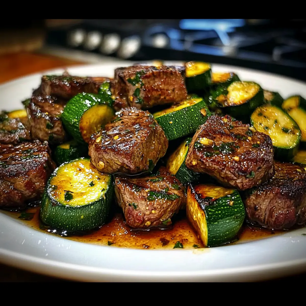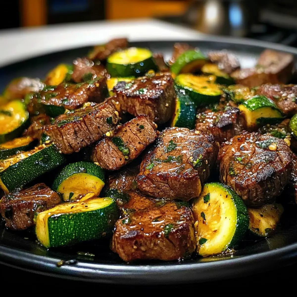 - Return steak cubes to skillet, toss in garlic butter and zucchini, and simmer for 1-2 minutes.