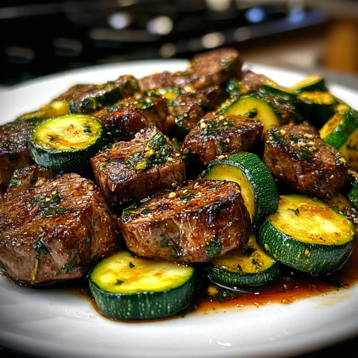 Return the seared steak cubes to the skillet with the zucchini, and toss them gently in the garlic butter sauce. Let everything simmer together for another 1-2 minutes, ensuring the steak bites are thoroughly combined with the garlic and zucchini, resulting in a rich, flavorful finish.