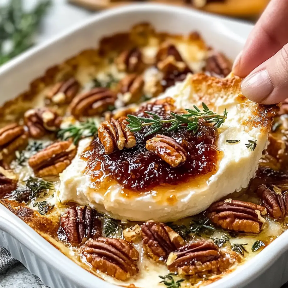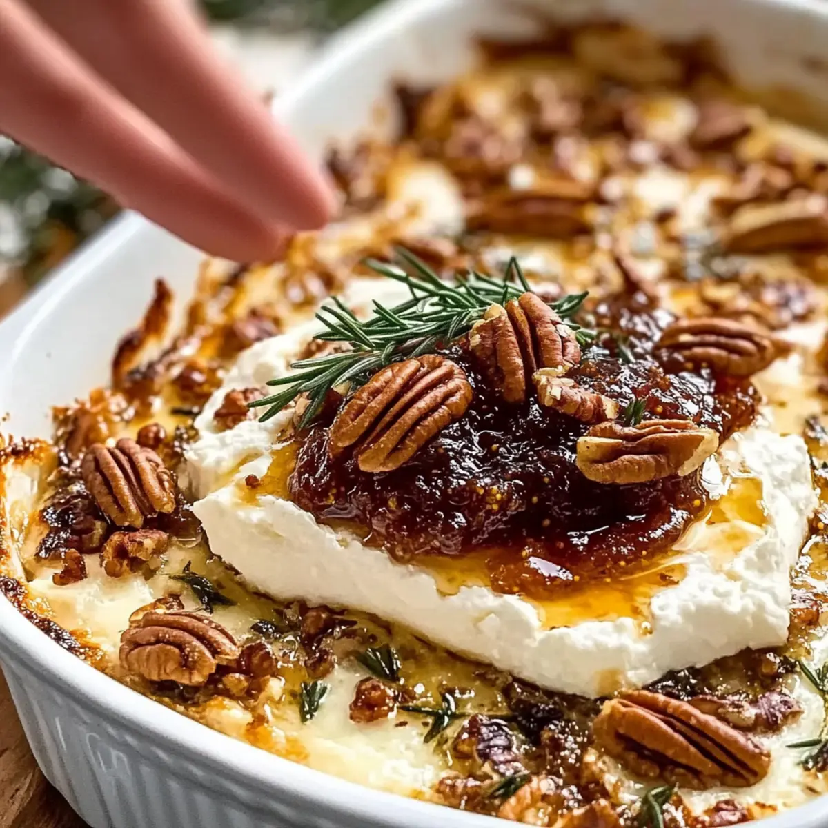After baking, remove the dish from the oven and allow it to cool slightly for about 5 minutes. Sprinkle the toasted pecans and freshly chopped thyme and rosemary on top. This adds not only texture but also vibrant color and aromatic freshness to your Goat Cheese Appetizer Spread.