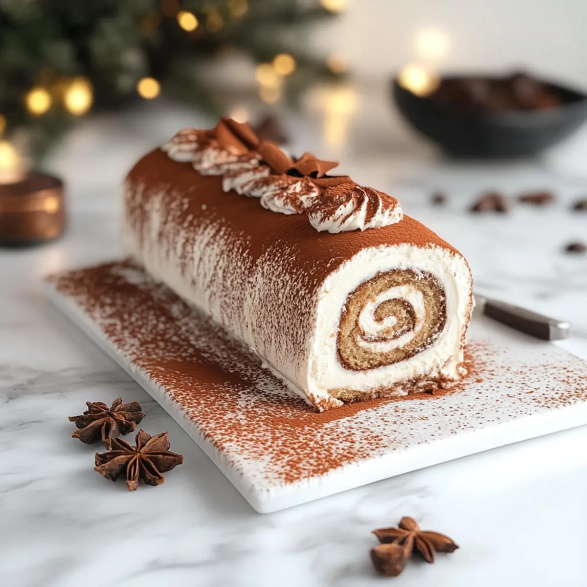 Before serving, dust the outside of the cake with cocoa powder for an elegant touch. For a clean presentation, trim the ends of the yule log. Slice into servings and delight in the rich coffee flavors of your Gourmet Tiramisu Yule Log Cake, perfect for festive gatherings!