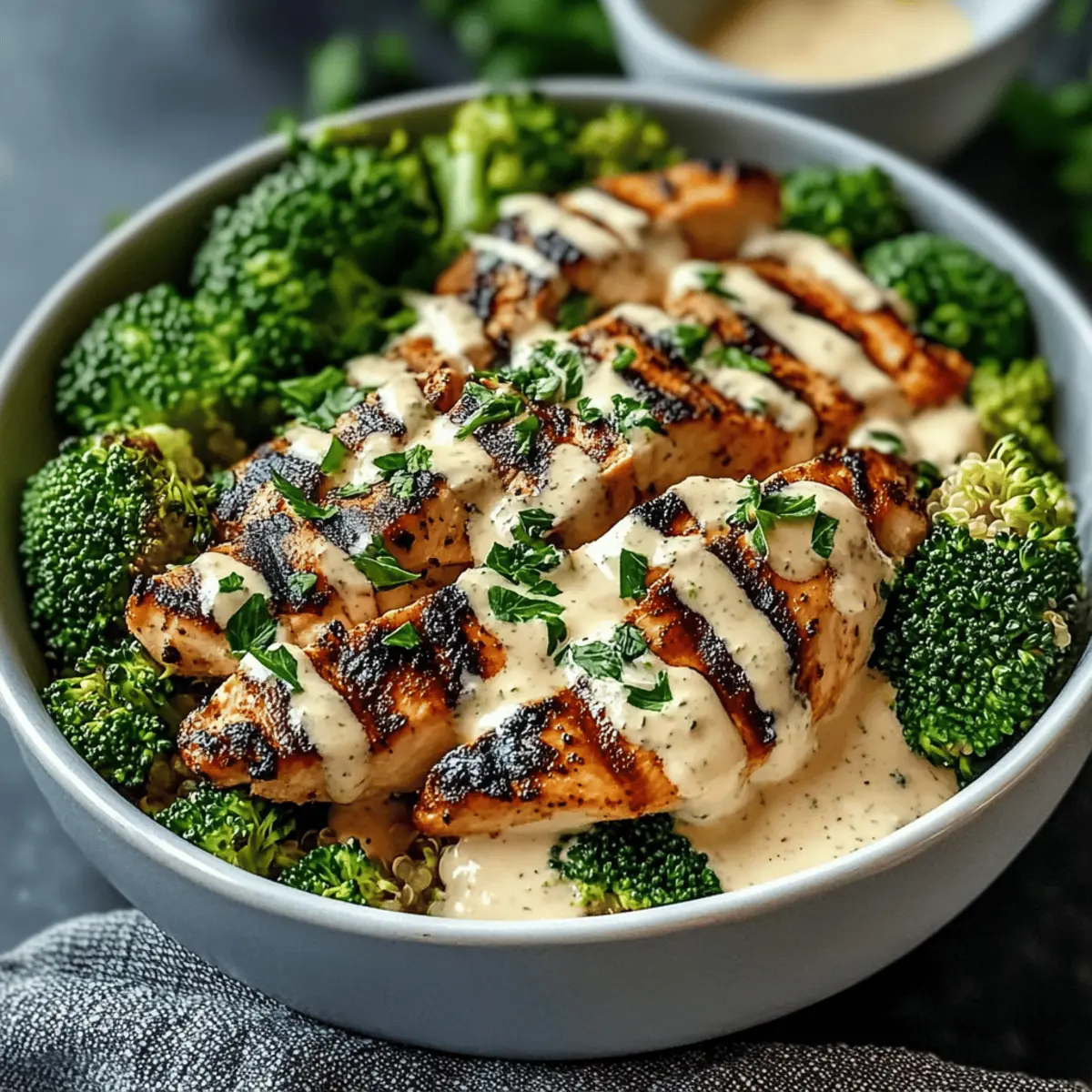 Grilled Chicken & Broccoli Bowls with Creamy Garlic Sauce Delight