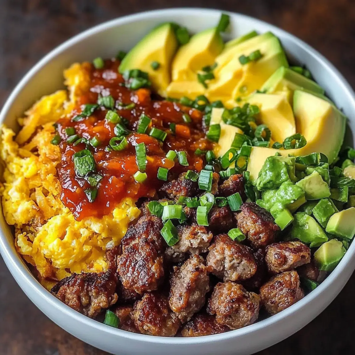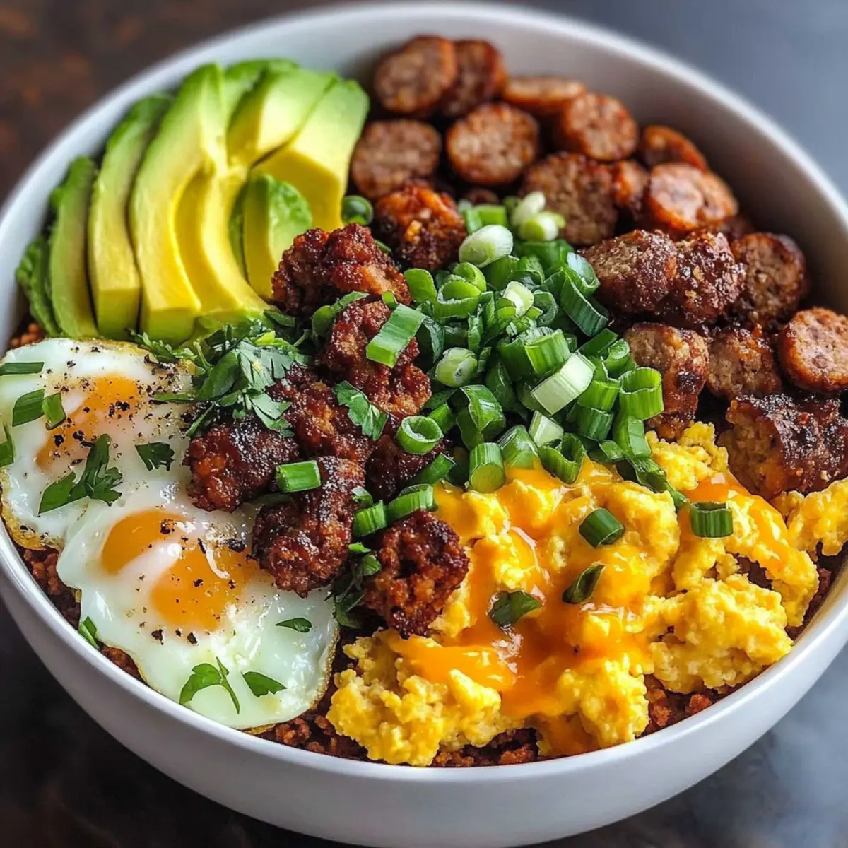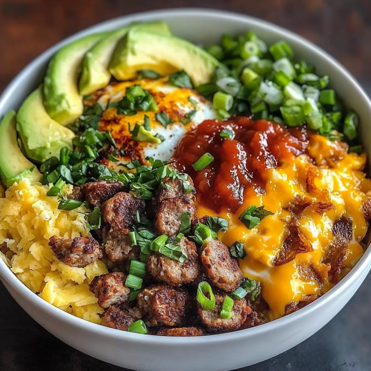 Veggie Delight: Swap the sausage for sautéed mushrooms, bell peppers, and zucchini, bringing a medley of textures and flavors to this filling breakfast bowl.