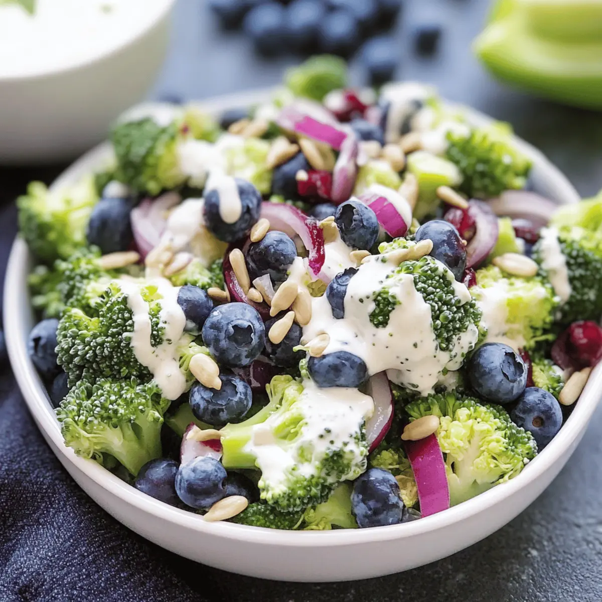 - Wash and cut fresh broccoli into bite-sized pieces. In a mixing bowl, combine broccoli, blueberries, red onion, dried cranberries, and sunflower seeds, mixing gently.