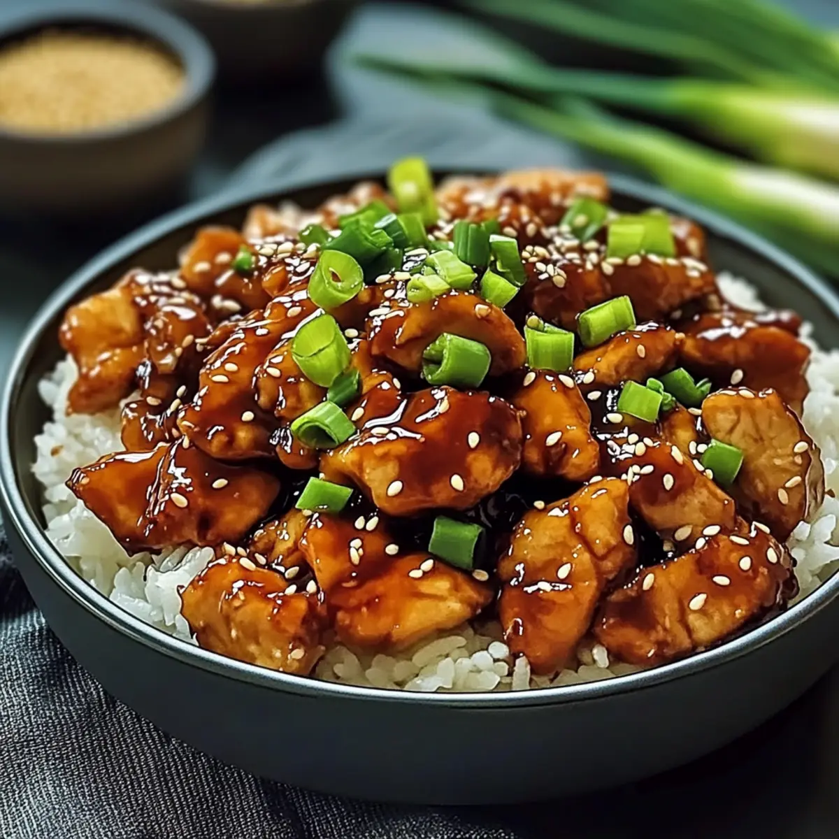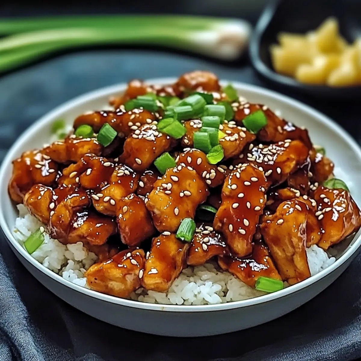 - Serve: Transfer the chicken to a serving platter, garnish with sliced green onions and sesame seeds, and serve with jasmine rice and vegetables.
