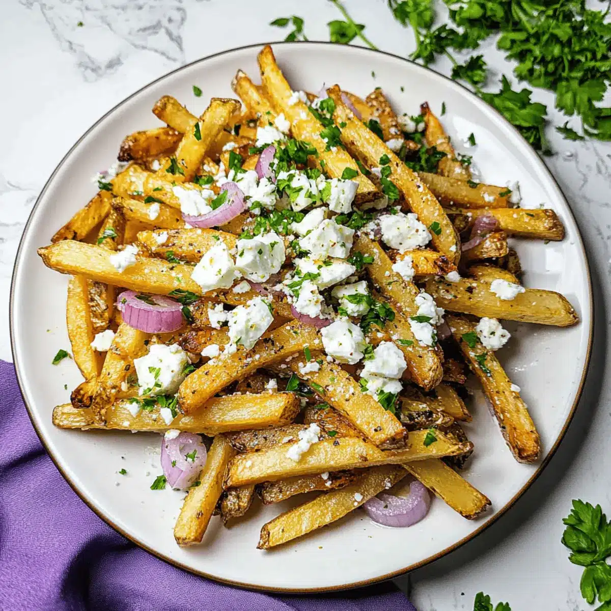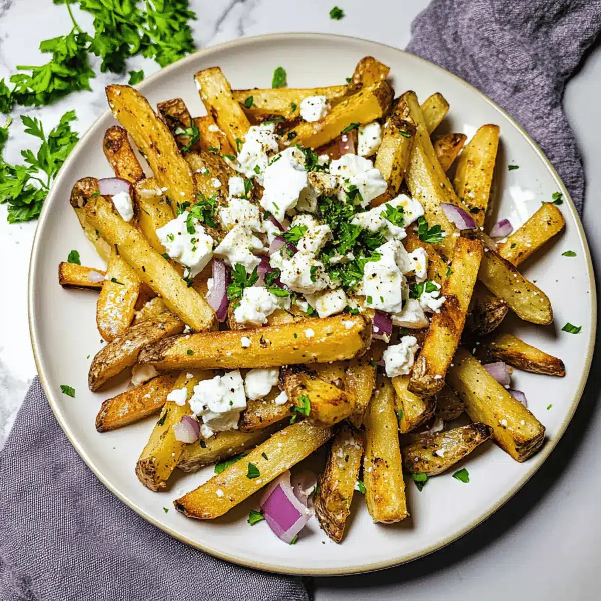 Once the fries are done, transfer them to a serving plate while they’re still warm. Sprinkle the crispy fries generously with fresh parsley, chopped red onion, and crumbled feta cheese to create that irresistible burst of flavor that defines your homemade Greek fries.