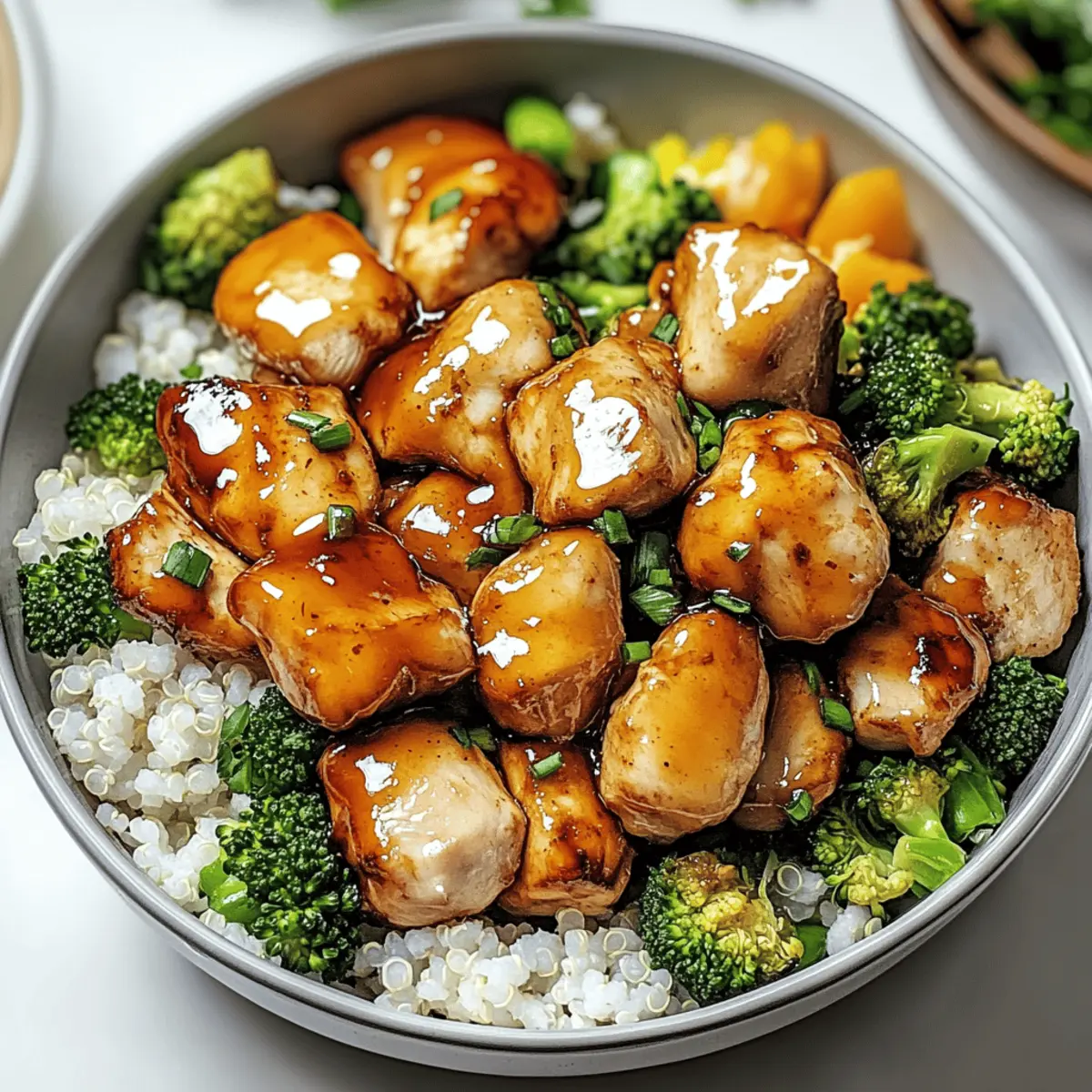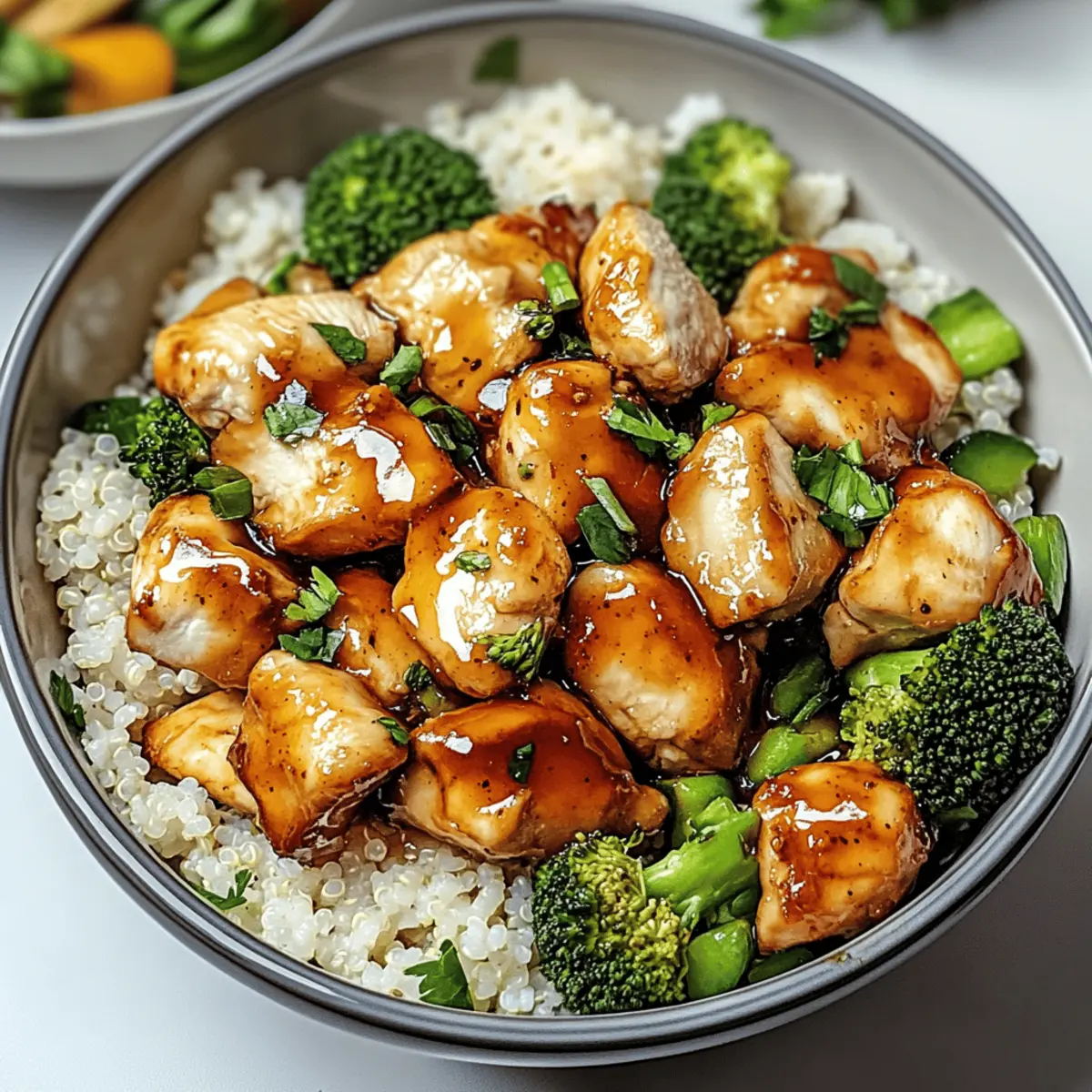 - Spoon rice or quinoa into bowls, top with glazed chicken and vegetables, and drizzle remaining sauce on top.