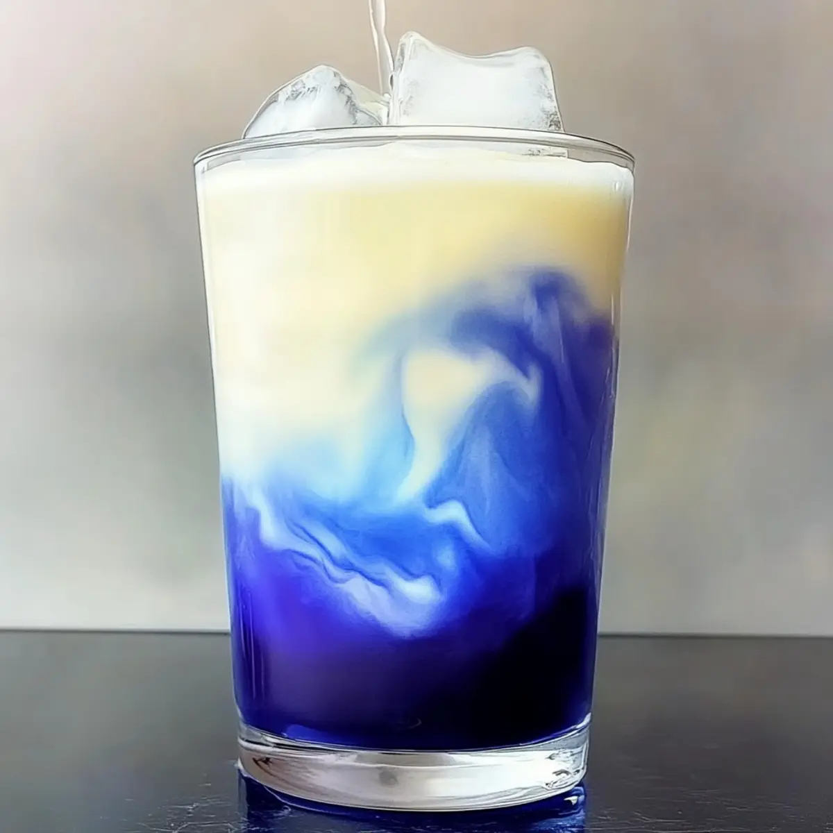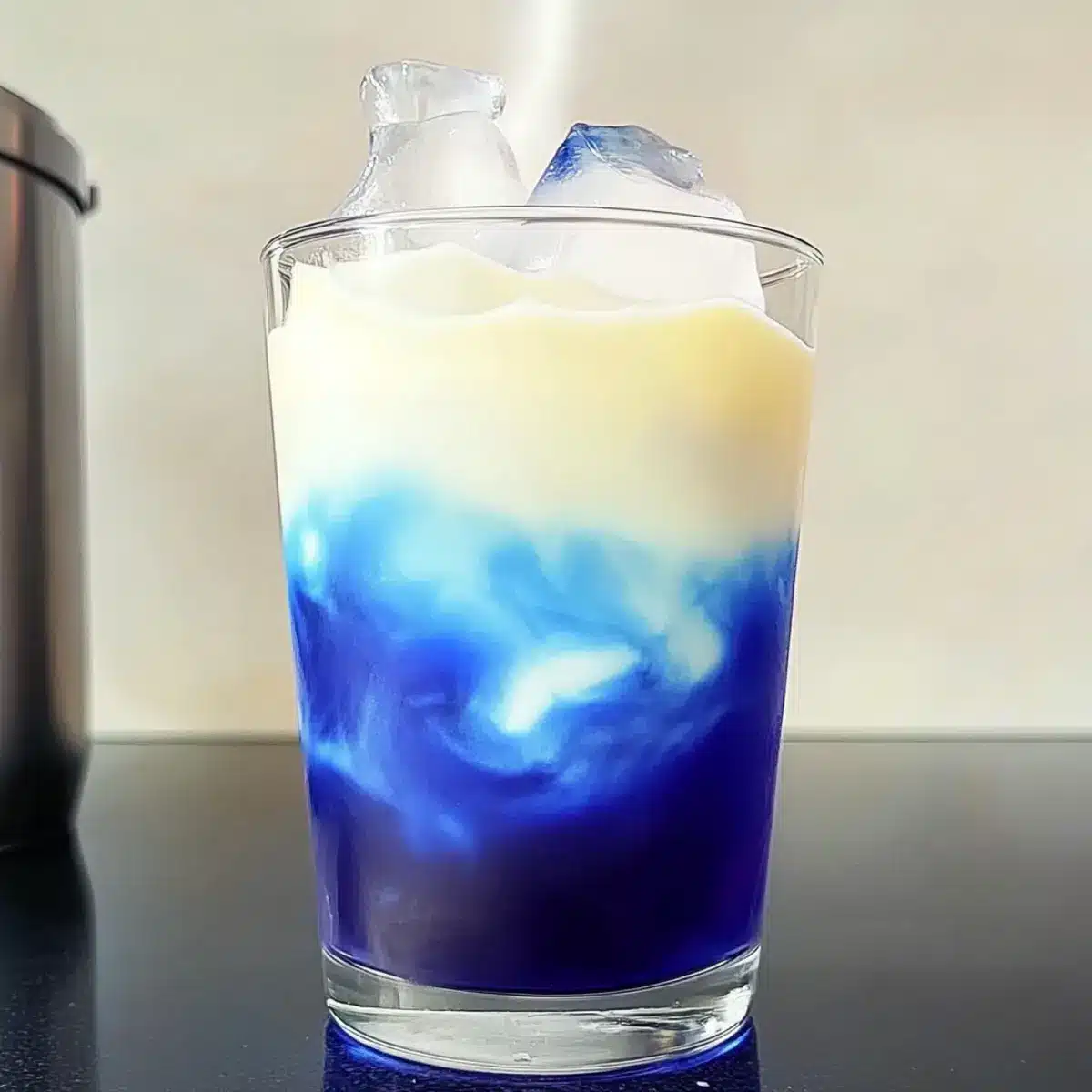 - Fill a tall glass with ice cubes and pour the cooled blue tea over the ice, then gently spoon or pour the vanilla foam on top.