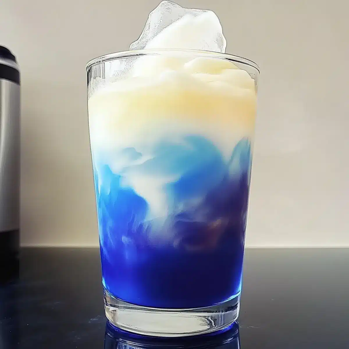 While the blue tea cools, prepare the vanilla cold foam. In a blender, combine ⅓ cup of ice-cold milk or your choice of dairy-free alternative with one tablespoon of vanilla syrup. Blend on high for about 10 seconds until the mixture is smooth and frothy. If you prefer, use a frother or shake it vigorously in a sealed jar to achieve that delightful foam texture.