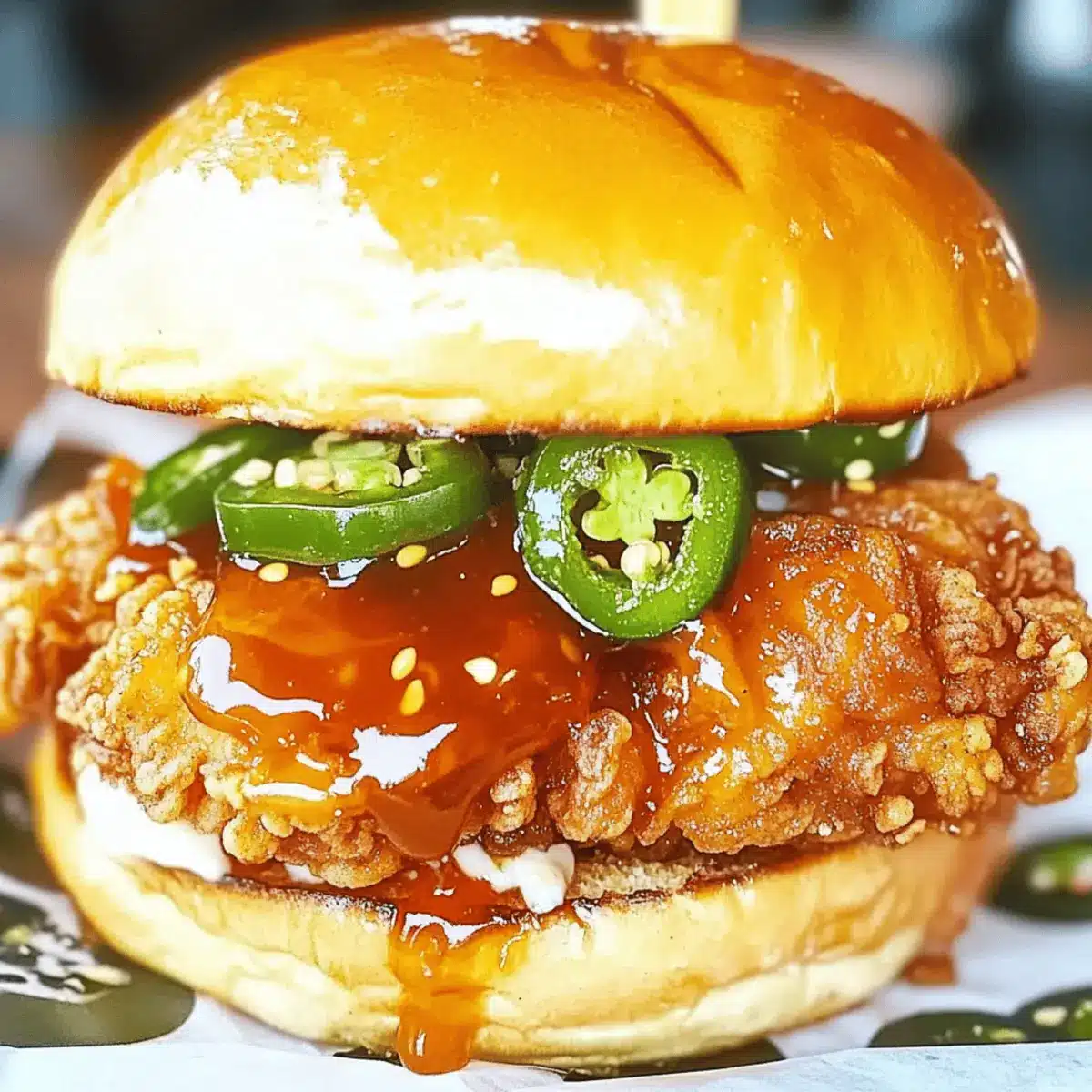 - Assemble the sandwiches with mayonnaise on toasted buns, topped with fried chicken and jalapeño honey.