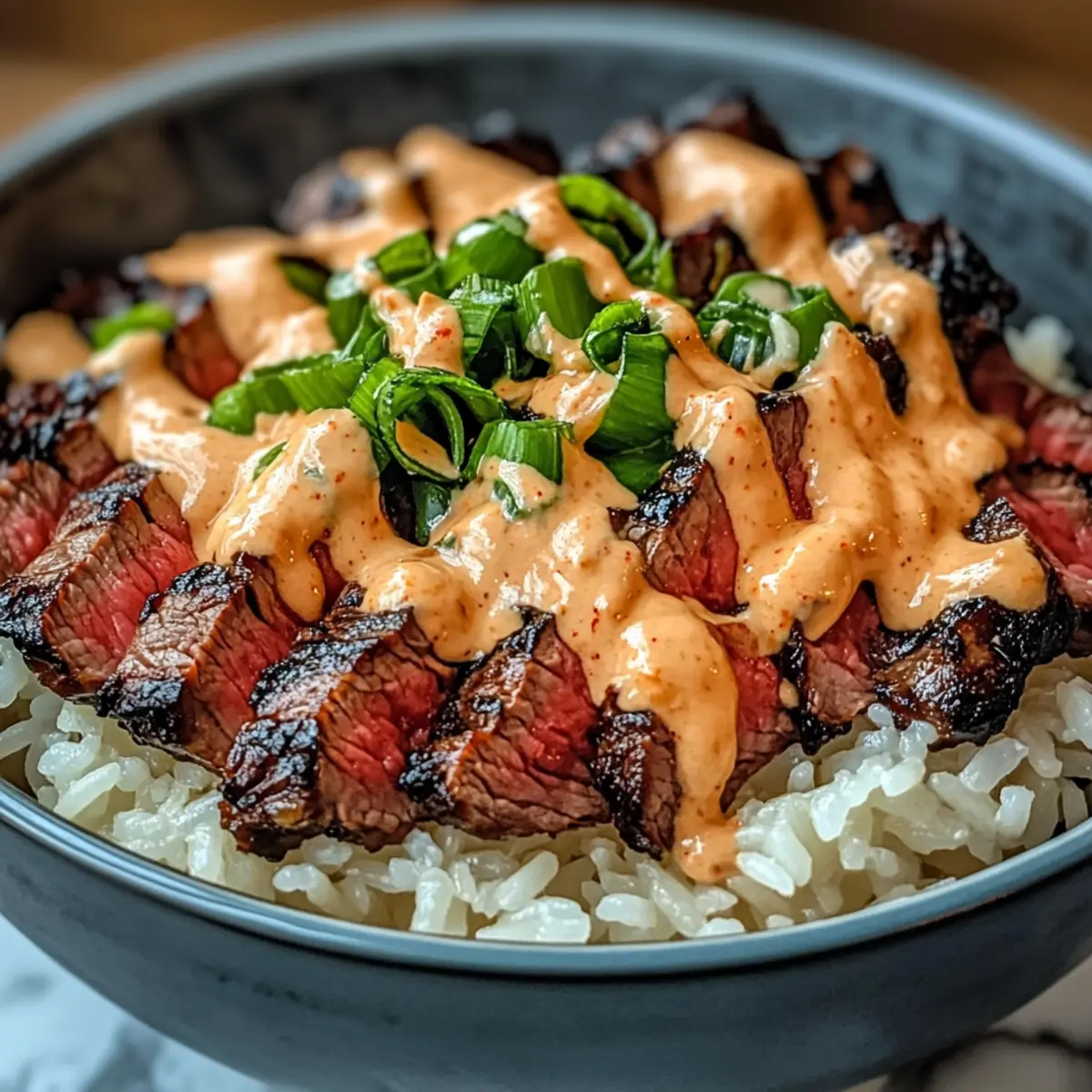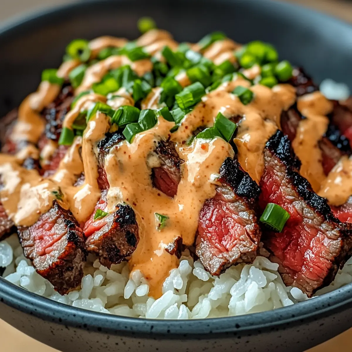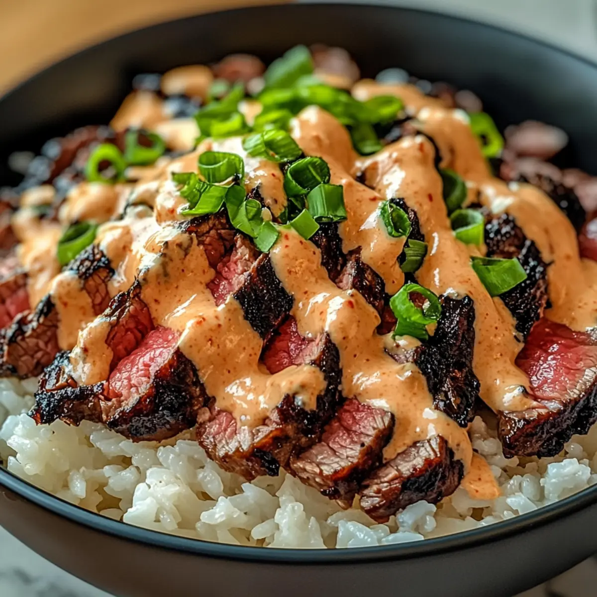 - Place rice in bowls, top with sliced steak, drizzle spicy cream sauce, and sprinkle green onions.