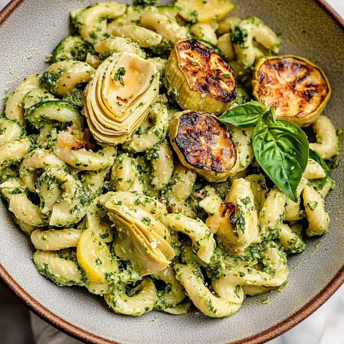 - Cook the pasta in boiling salted water until al dente (8-10 minutes). Drain and rinse under cold water, then combine with spinach and artichoke hearts.