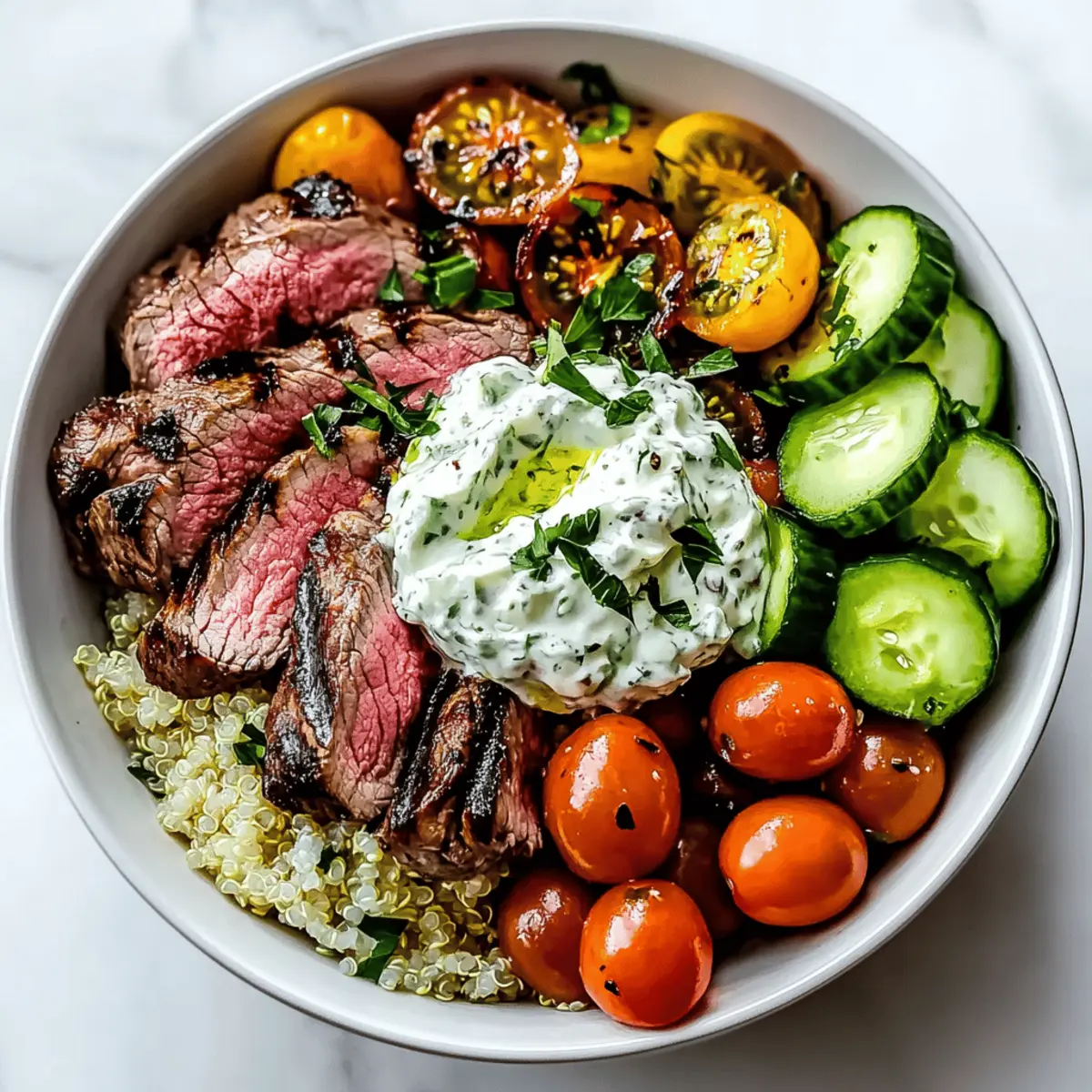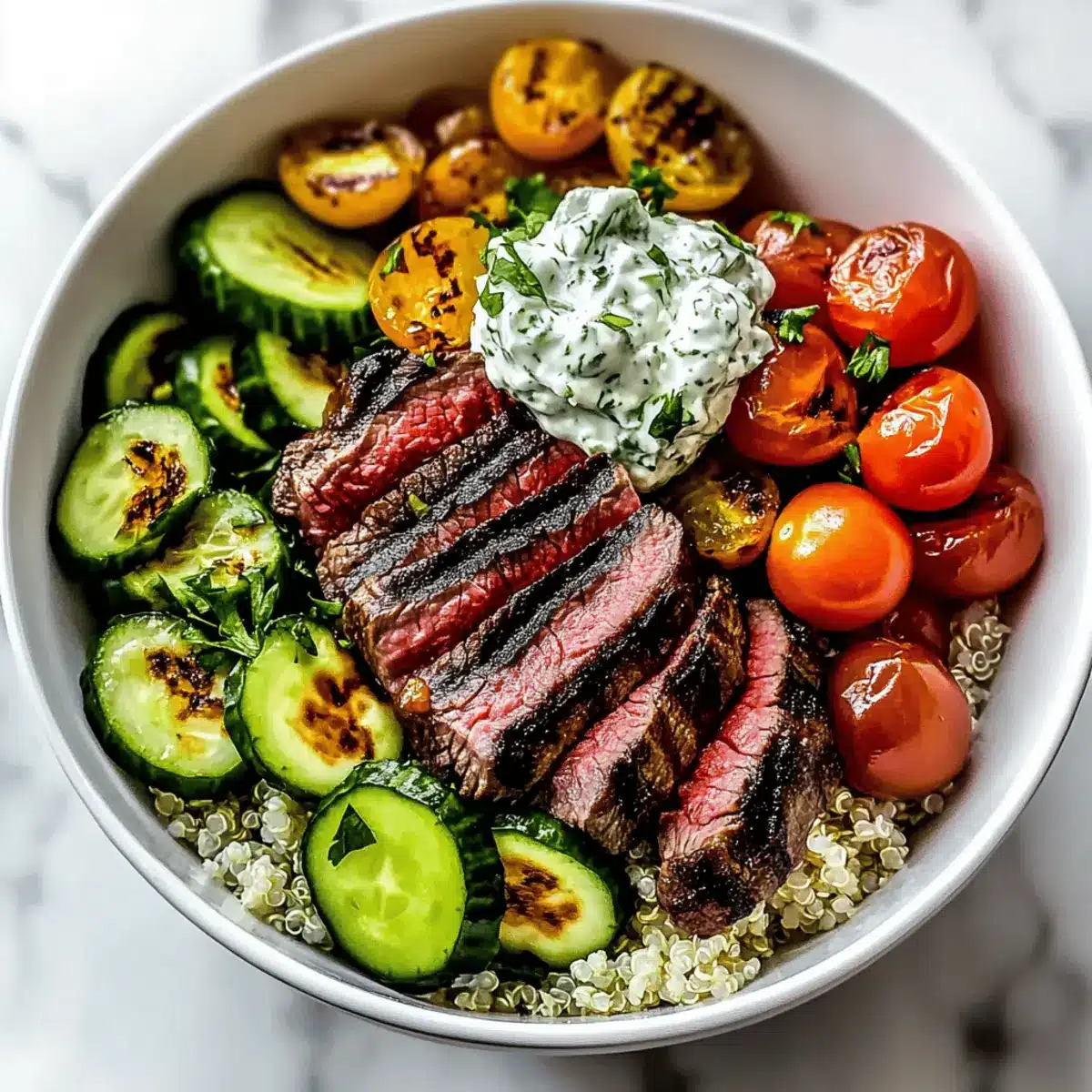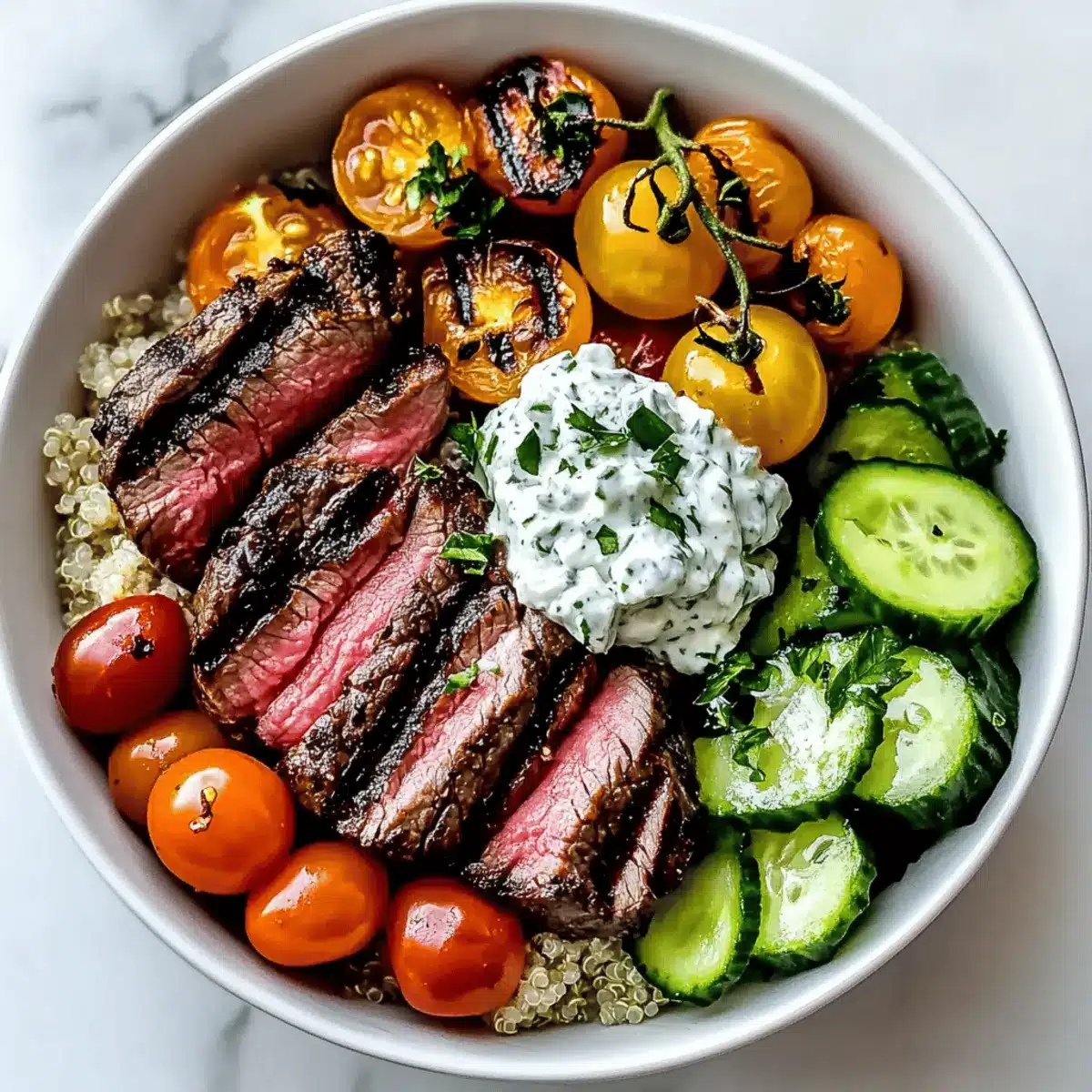 Start building your Mediterranean Steak Bowl by creating a base layer of cooked grains like brown rice, quinoa, or cauliflower rice in a bowl. Thinly slice the rested steak against the grain and arrange it on top of the grains. Next, add halved cherry tomatoes, diced cucumber, sliced red onion, and optional roasted chickpeas for crunch.