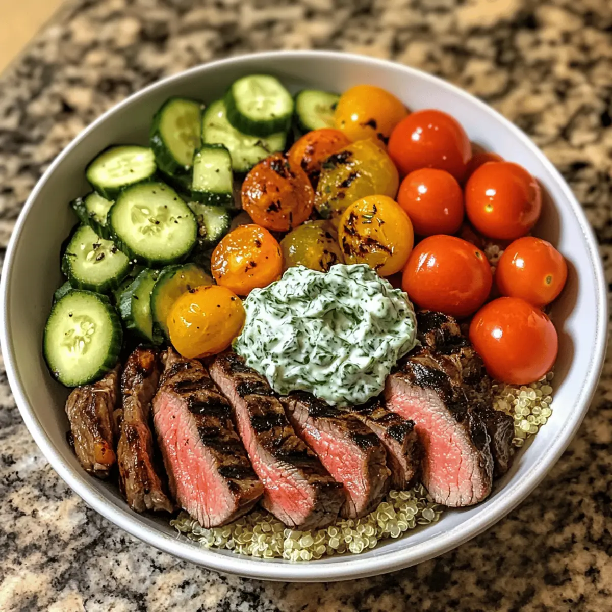 While the steak marinates, prepare the tzatziki sauce. In a separate bowl, combine Greek yogurt, finely diced cucumber, minced garlic, chopped dill, and a squeeze of lemon juice. Mix all ingredients until smooth and creamy. Cover the bowl and refrigerate it for at least 15 minutes to let the flavors meld together and chill; this will add a refreshing touch to your Mediterranean Steak Bowl.