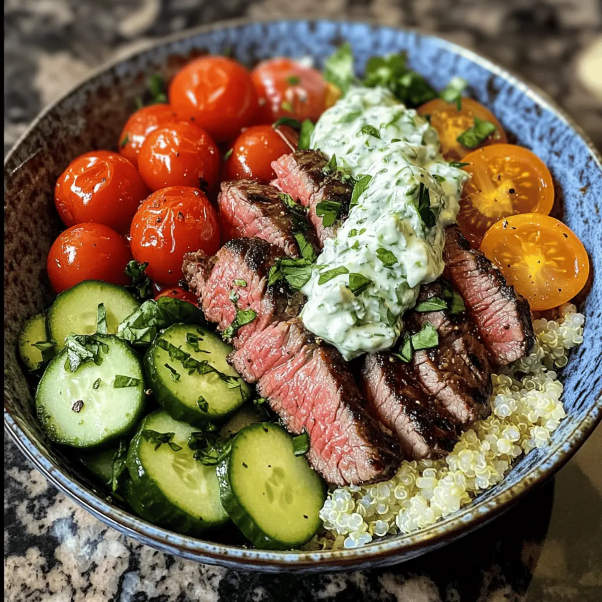 Finally, generously drizzle the homemade tzatziki sauce over the assembled Mediterranean Steak Bowl, letting it cascade over the vibrant veggies and steak. Finish with a light drizzle of the lemon vinaigrette for a zesty kick. Garnish with fresh herbs like parsley or dill for an aromatic touch, and serve immediately for a delightful dining experience!