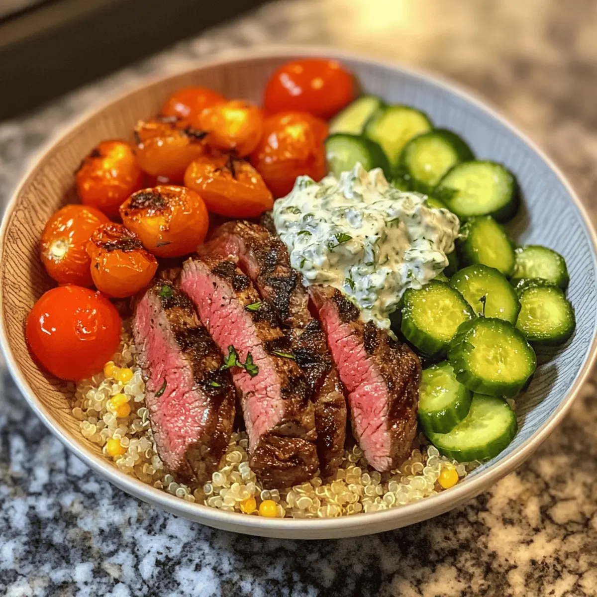 - Slice the steak thinly against the grain and assemble your bowl with cooked grains, sliced steak, cherry tomatoes, cucumber, red onion, and toppings.