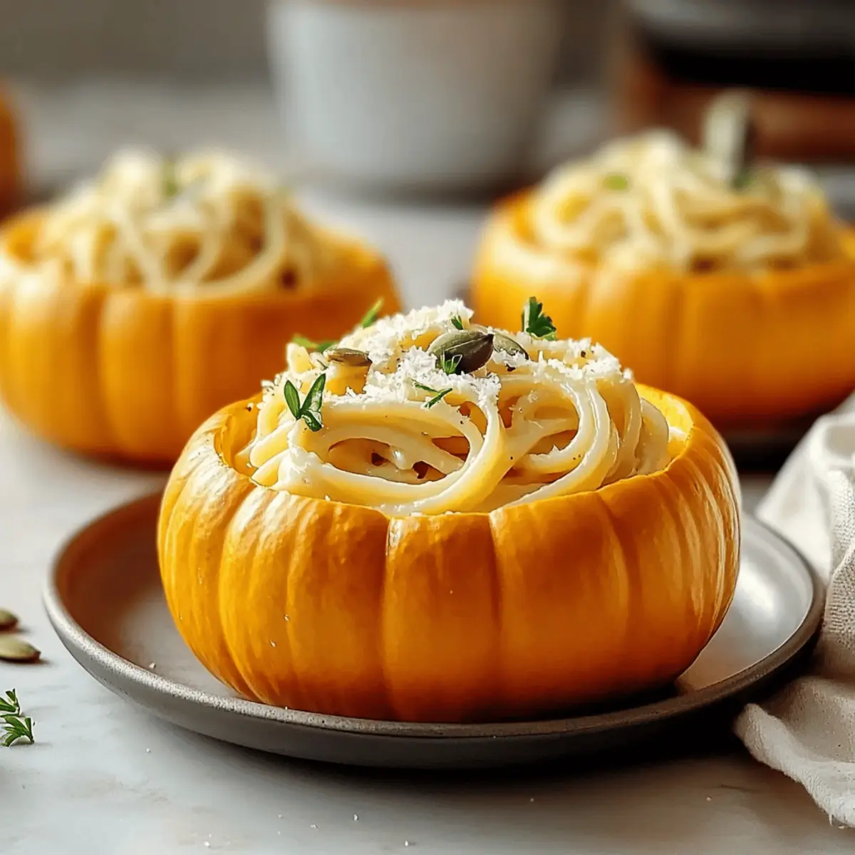 - Carefully fill each roasted pumpkin with the pasta Alfredo, creating charming nests.