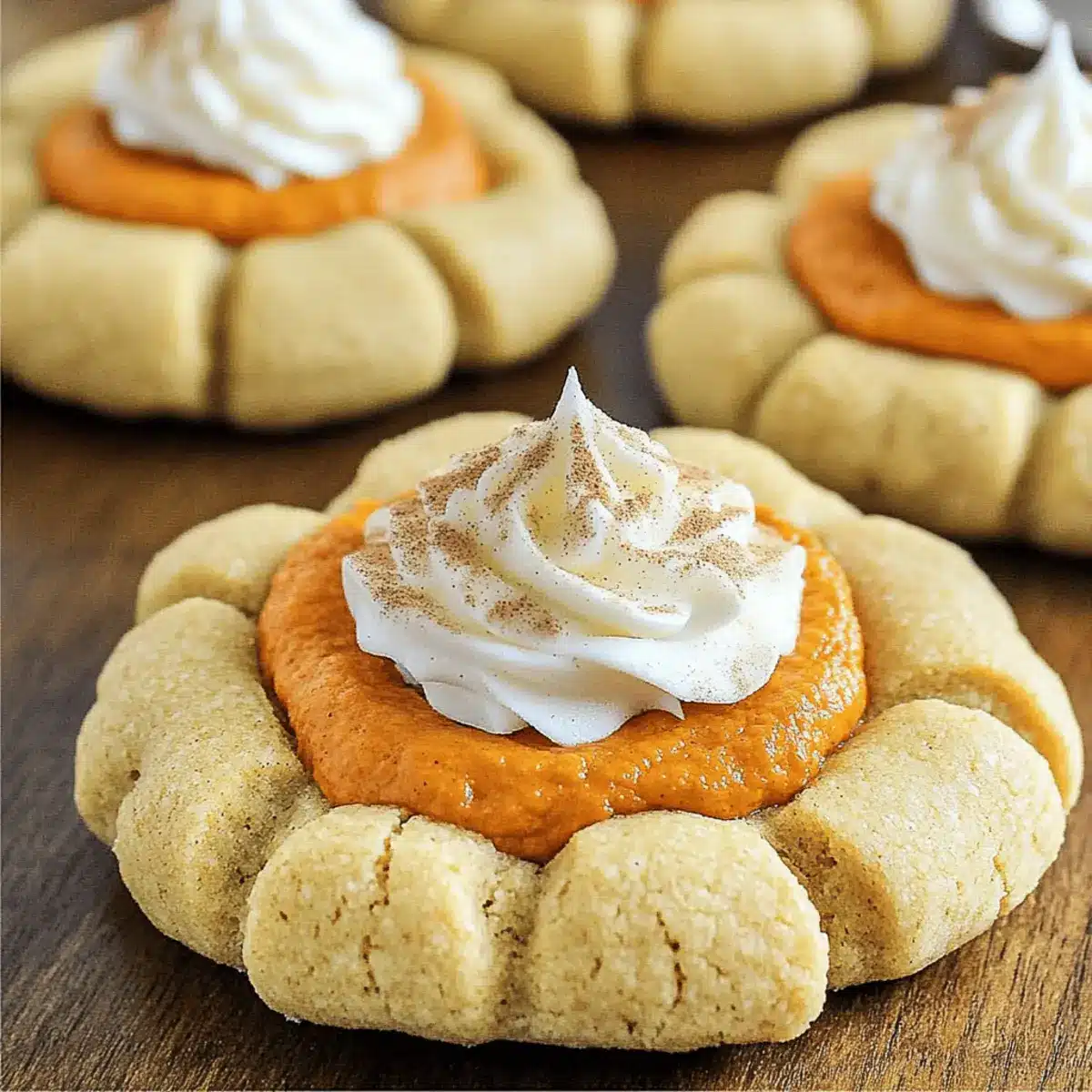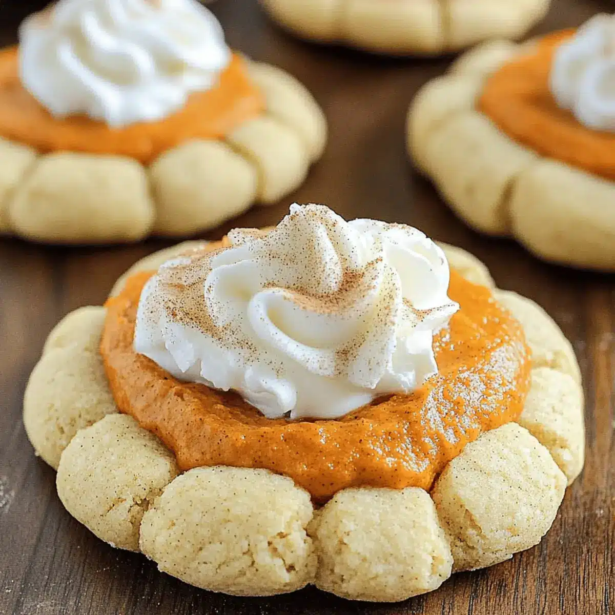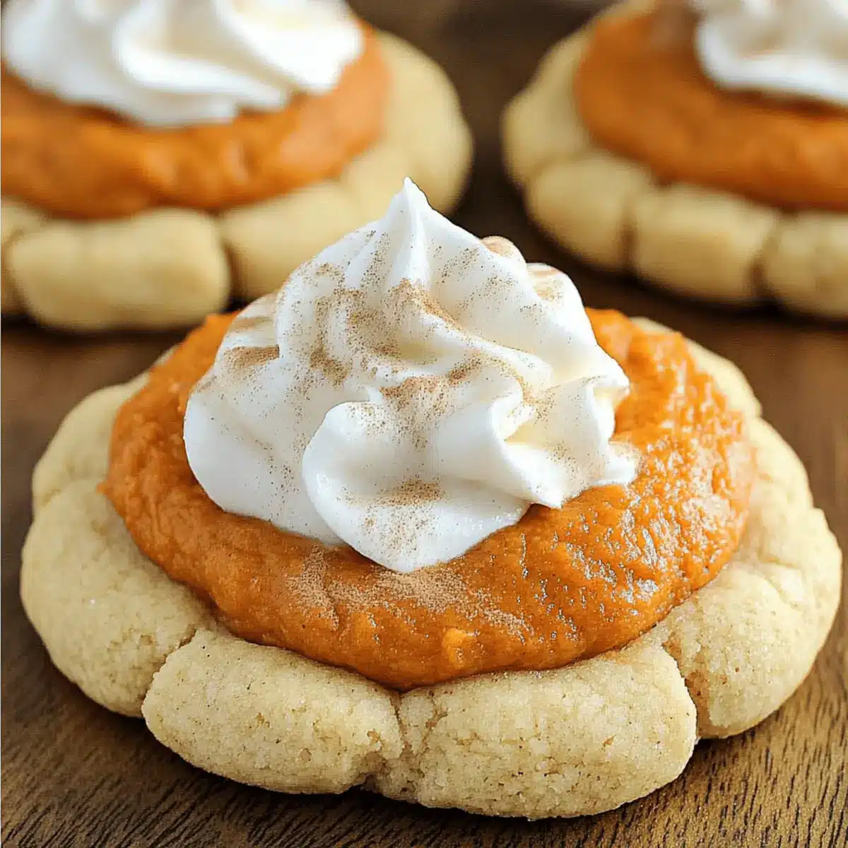 Finish off your Pumpkin Pie Cookies by topping them with whipped cream. You can either dollop it on each cookie or pipe it for a fancier touch. For an added festive flair, sprinkle a dash of ground cinnamon or nutmeg on top just before serving.