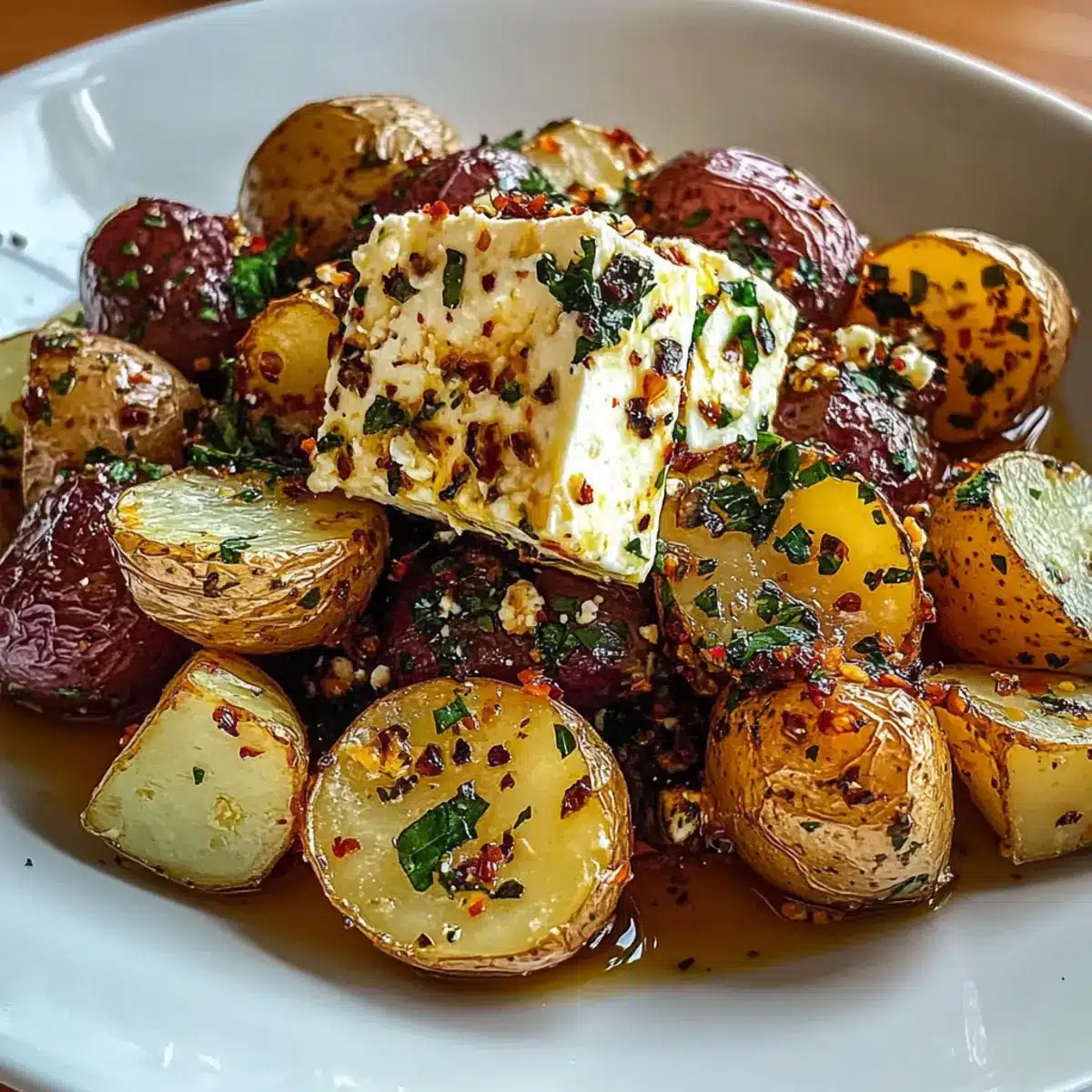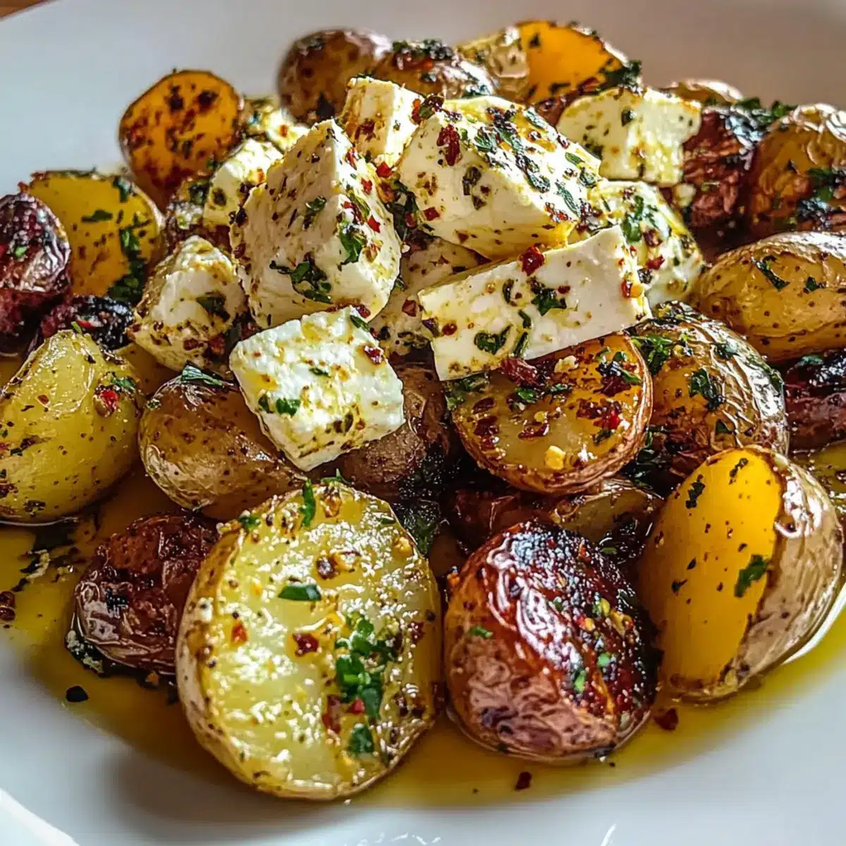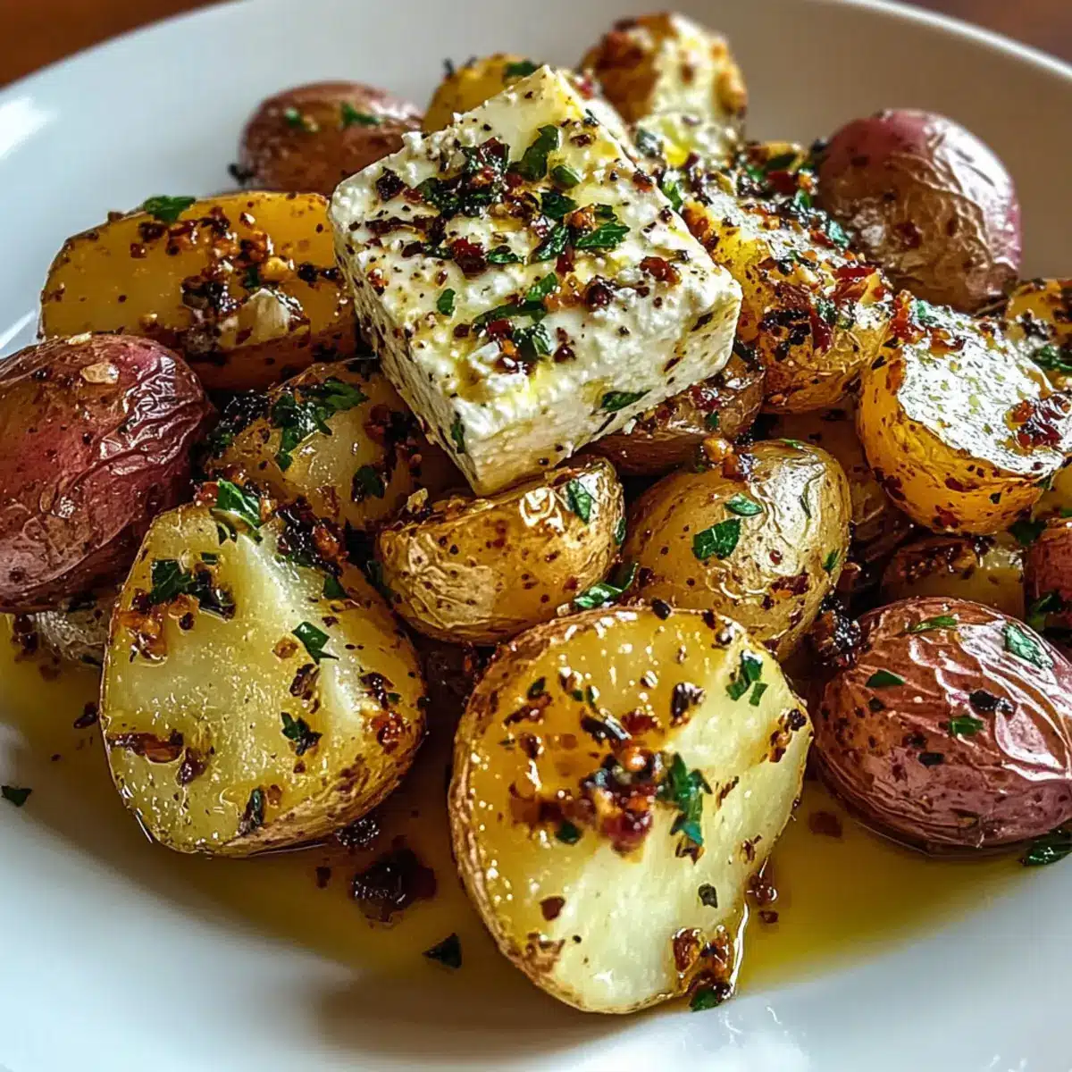 Scoop the roasted potatoes into a serving dish, and generously drizzle the creamy feta-garlic mixture over the top. Garnish with freshly chopped parsley for a burst of color and flavor. Consider a sprinkle of optional red pepper flakes for those who enjoy a little kick. Your Roasted Potatoes with Baked Feta and Garlic are now ready to be enjoyed!