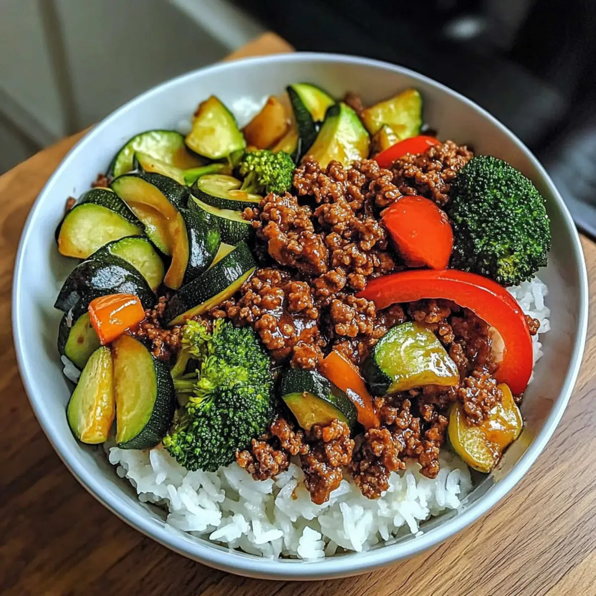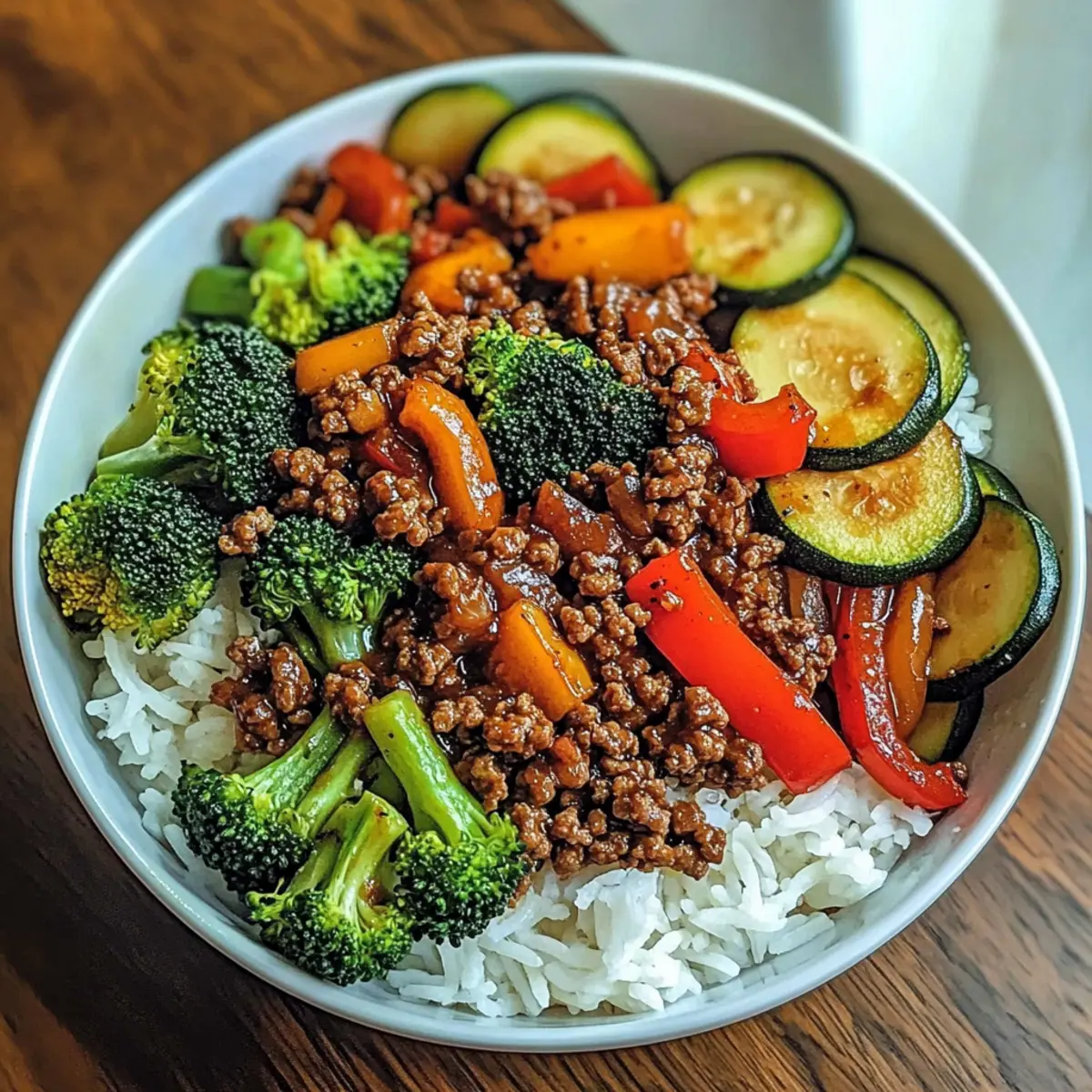 - Prepare your serving bowls by placing a generous scoop of fluffy steamed rice at the bottom. Top the rice with the savory ground beef mixture, then pile on the sautéed veggies.