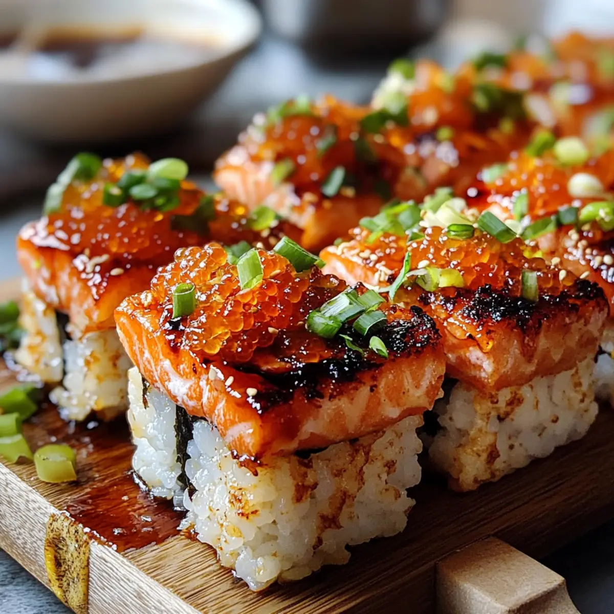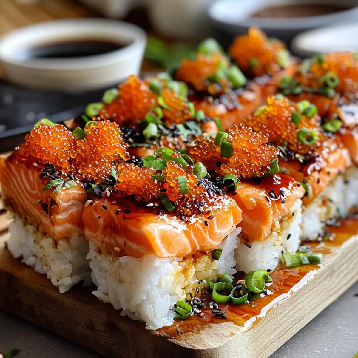 Once baked, remove the dish from the oven and allow it to cool slightly for about 5 minutes. Garnish with additional green onions, nori strips, and tobiko if desired. Serve your Spicy Salmon Sushi Bake warm for a delightful, shareable meal that brings everyone together!
