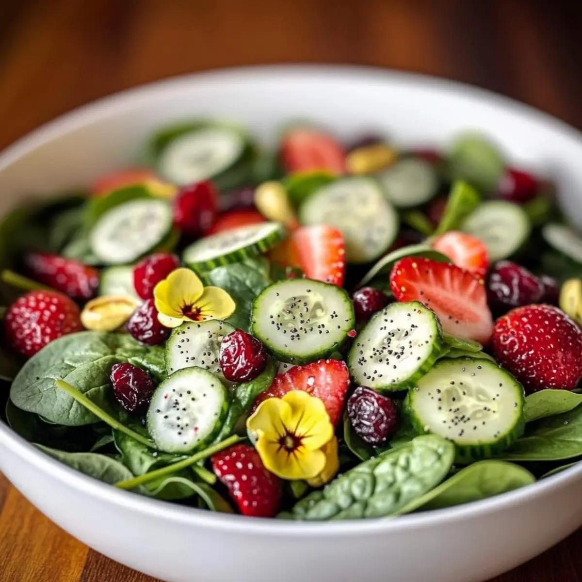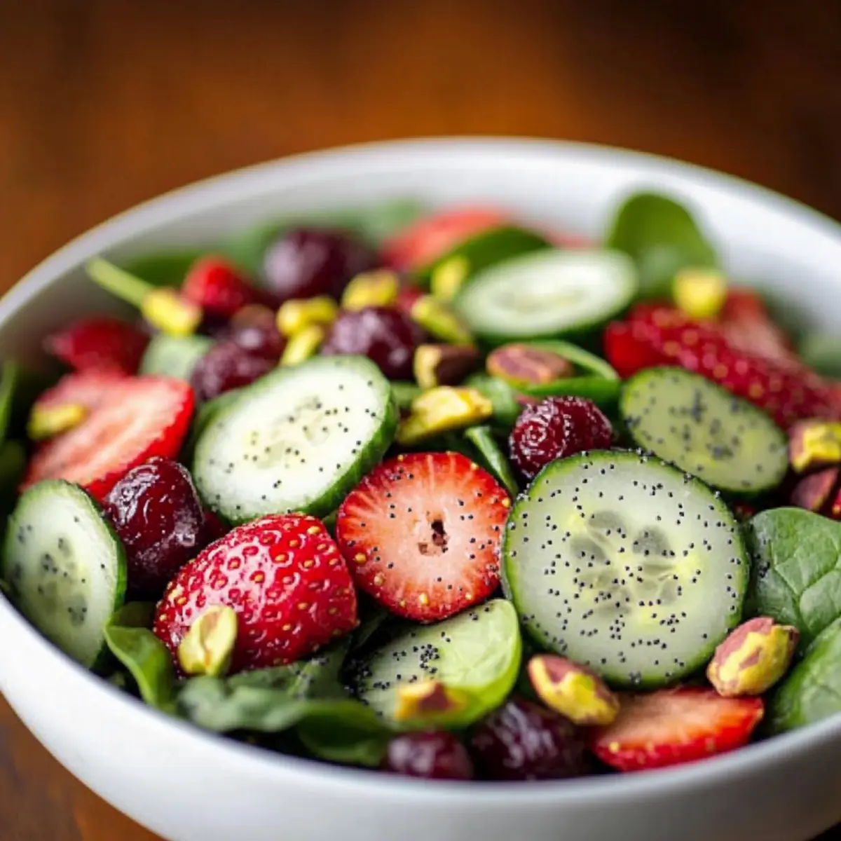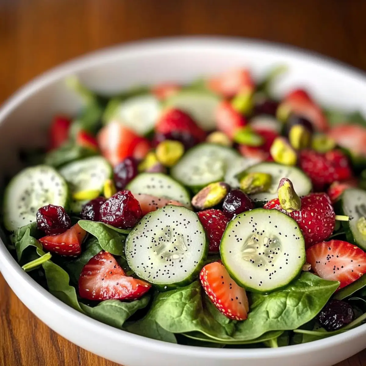 - In a large mixing bowl, layer 4 cups of fresh baby spinach, 1 ½ cups of sliced strawberries, and 1 cup of sliced cucumber. Add ¼ cup of thinly sliced red onion and ⅓ cup of Lemon Basil Poppy Seed Dressing. Toss gently for about 1 minute until well combined.