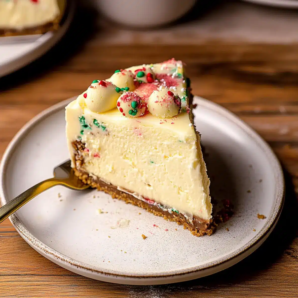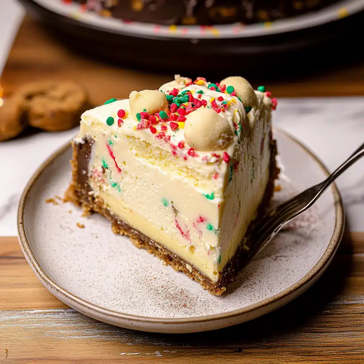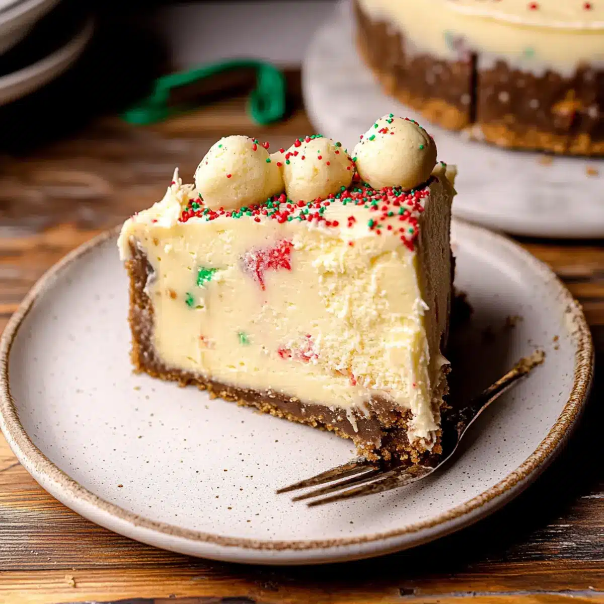 To ensure the cookie dough is safe to eat, bake ½ cup of flour on a baking sheet at 350°F (175°C) for 5 minutes to eliminate bacteria. In a separate bowl, cream together the baked flour with unsalted butter, sugar, vanilla extract, milk, and Christmas sprinkles, mixing until smooth. Roll the mixture into small balls and freeze them while you prepare the cheesecake filling.