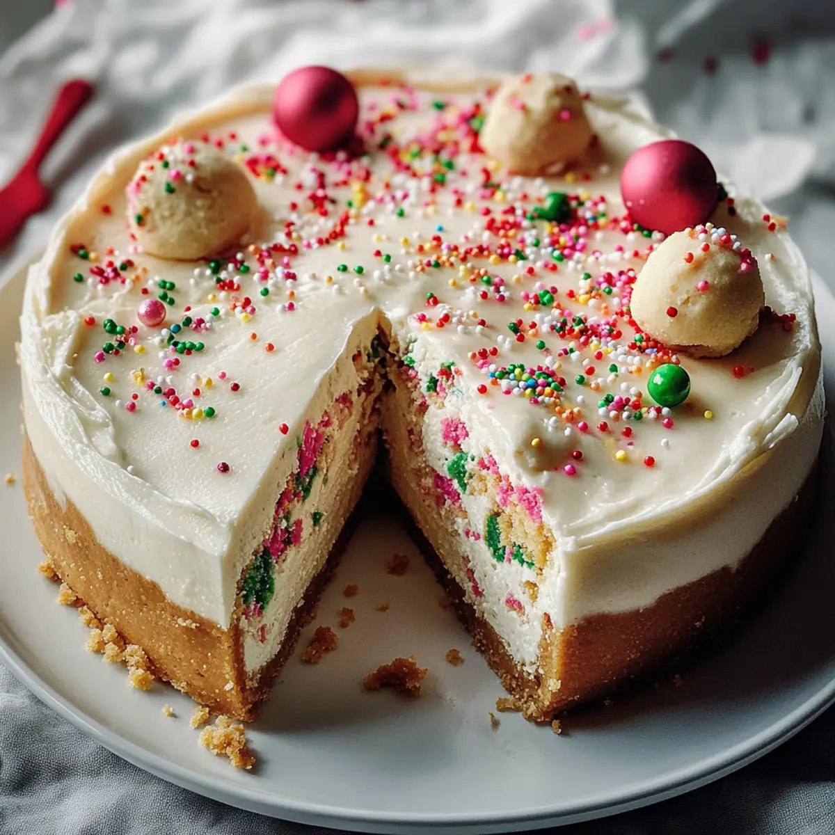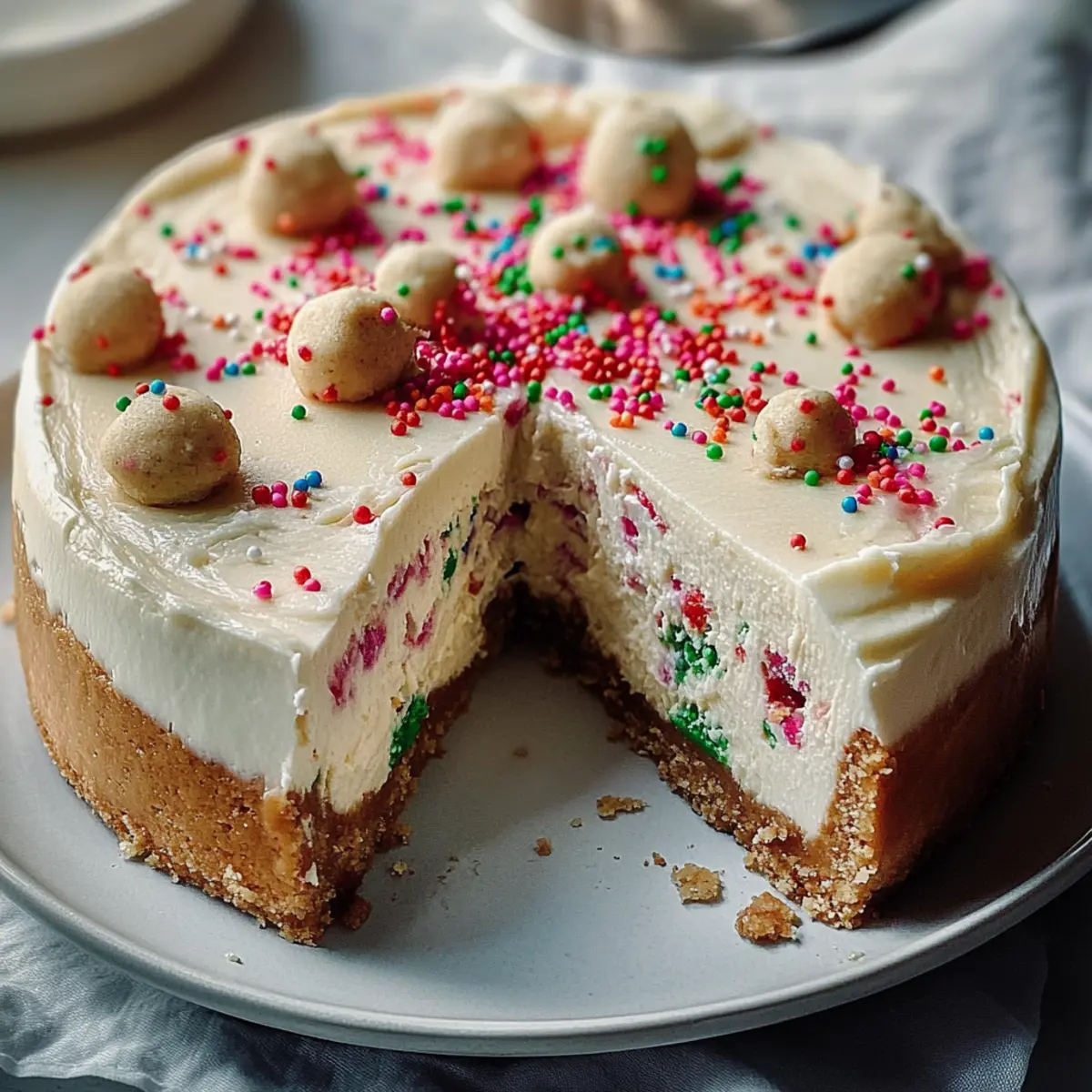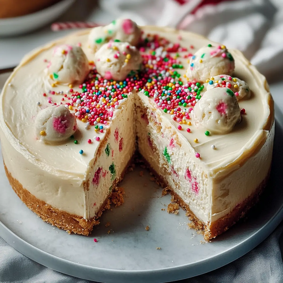 Playful Presentation: Topped with edible cookie dough balls and colorful sprinkles, this cheesecake shines on any dessert table, adding a fun and festive touch.