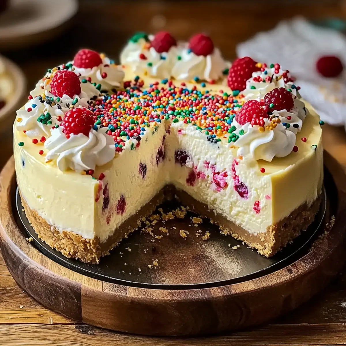 - Remove cheesecake from pan and top with whipped cream, sugar sprinkles, and fresh berries before serving.