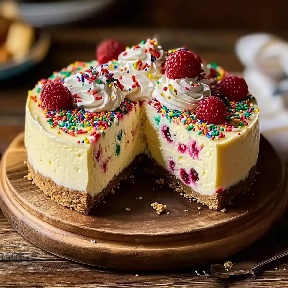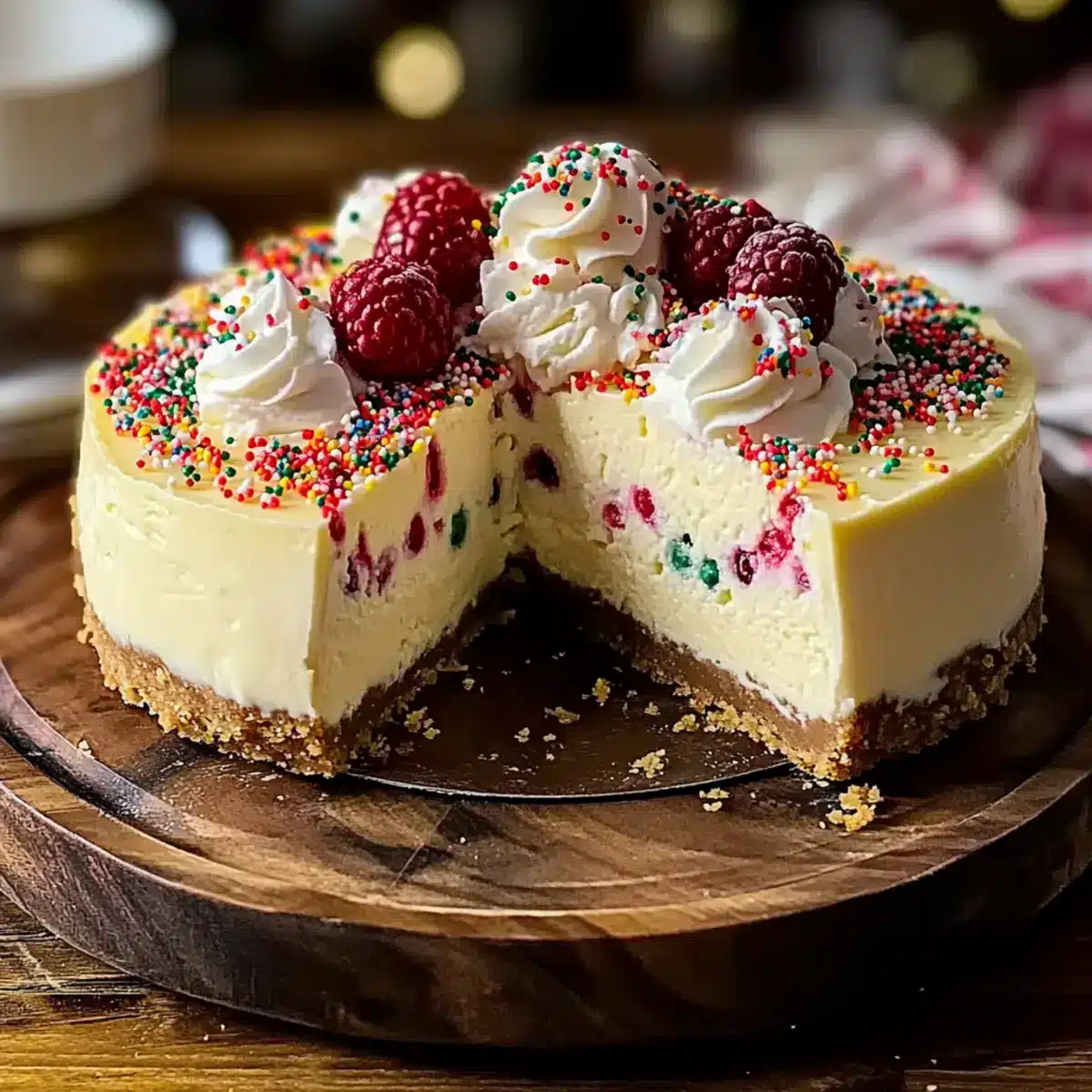 When ready to serve, carefully remove the cheesecake from the springform pan. Top with whipped cream, sprinkle colorful sugar sprinkles, and add fresh berries for a pop of color. This beautiful presentation will enhance the charm of your Sugar Cookie Cheesecake, making it a delightful treat for any gathering.