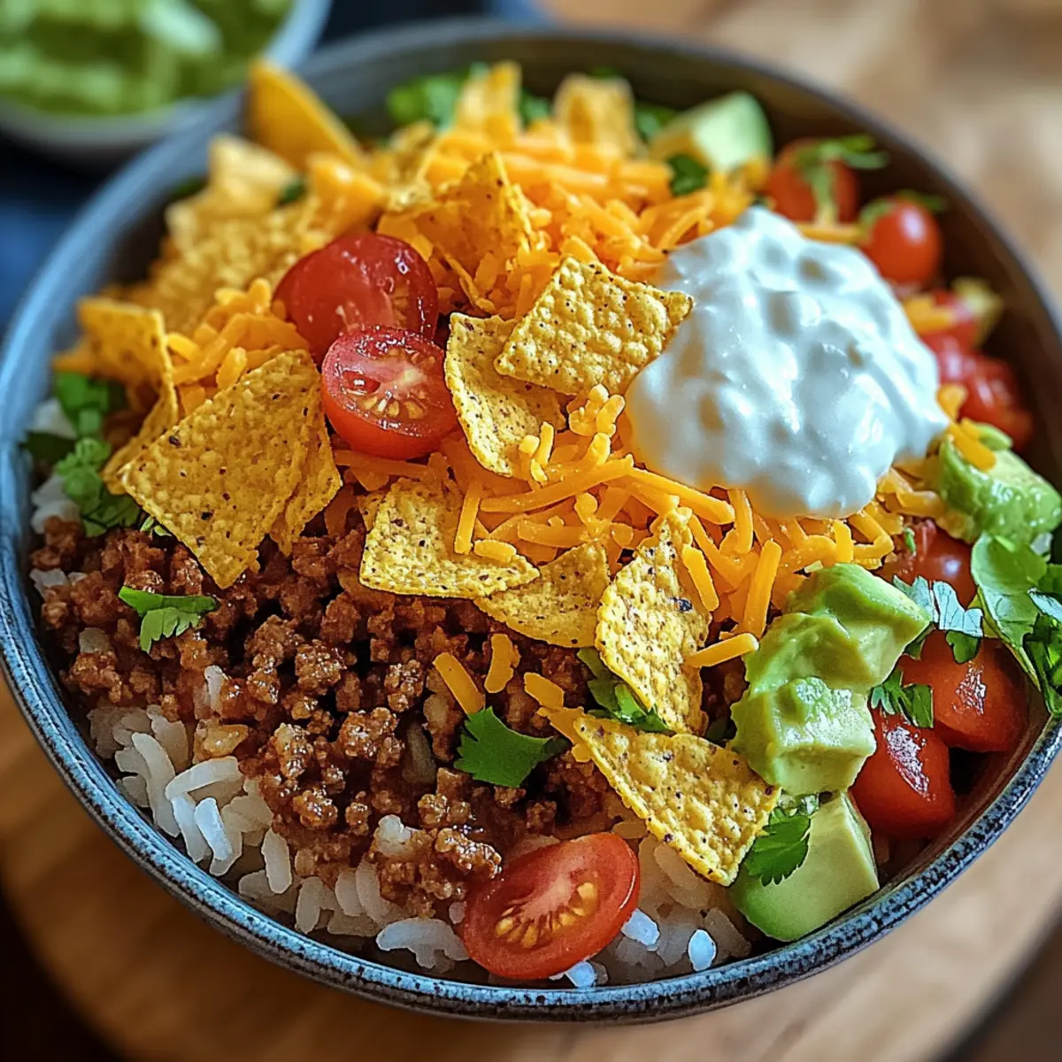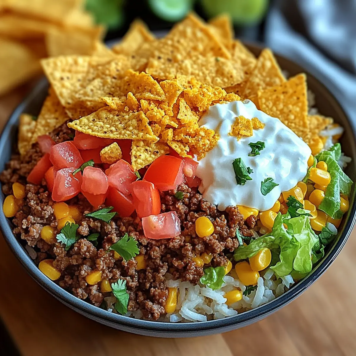 Finally, to bring that iconic crunch, crush a handful of Doritos and sprinkle them over the top just before serving. This creates a delightful contrast of textures, making your Taco Rice Bowl fun and satisfying. Enjoy the explosion of flavors with every bite!