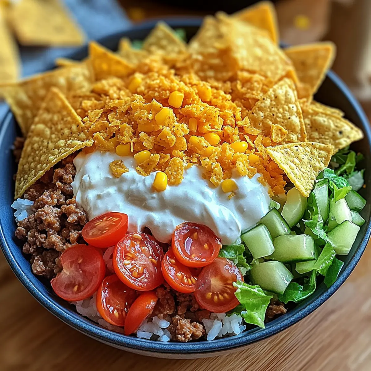 As I flipped through my recipe cards one evening, I stumbled upon a familiar favorite that sparked joy—a Taco Rice Bowl with Doritos. This dish marries the comforting elements of Tex-Mex cuisine with the fun crunch of everyone’s beloved snack, right at your dinner table. In just about 30 minutes, you can whip up a savory meal that’s not only quick but also easily customizable to suit every palate, from hearty meat lovers to vegetarians craving a twist. The delightful combination of textures—warm seasoned meat, fluffy rice, and that satisfying crunch—makes it perfect for family dinners or casual gatherings. What toppings will you choose to make this dish truly yours?