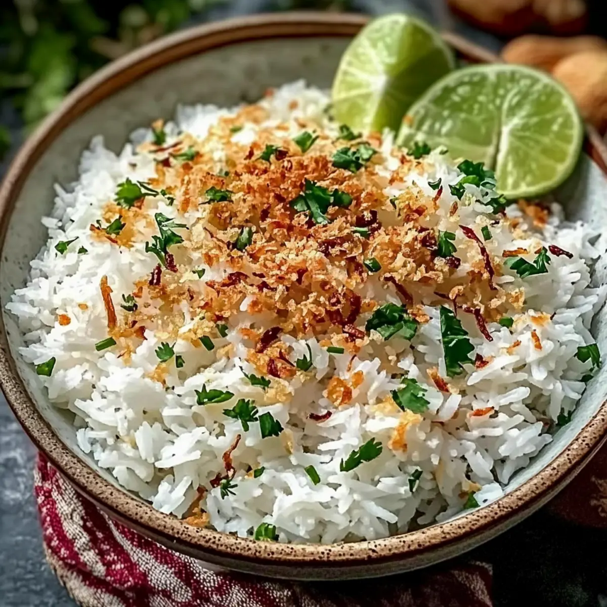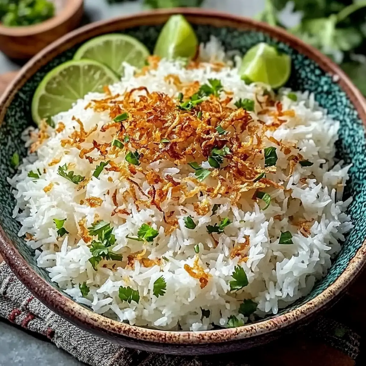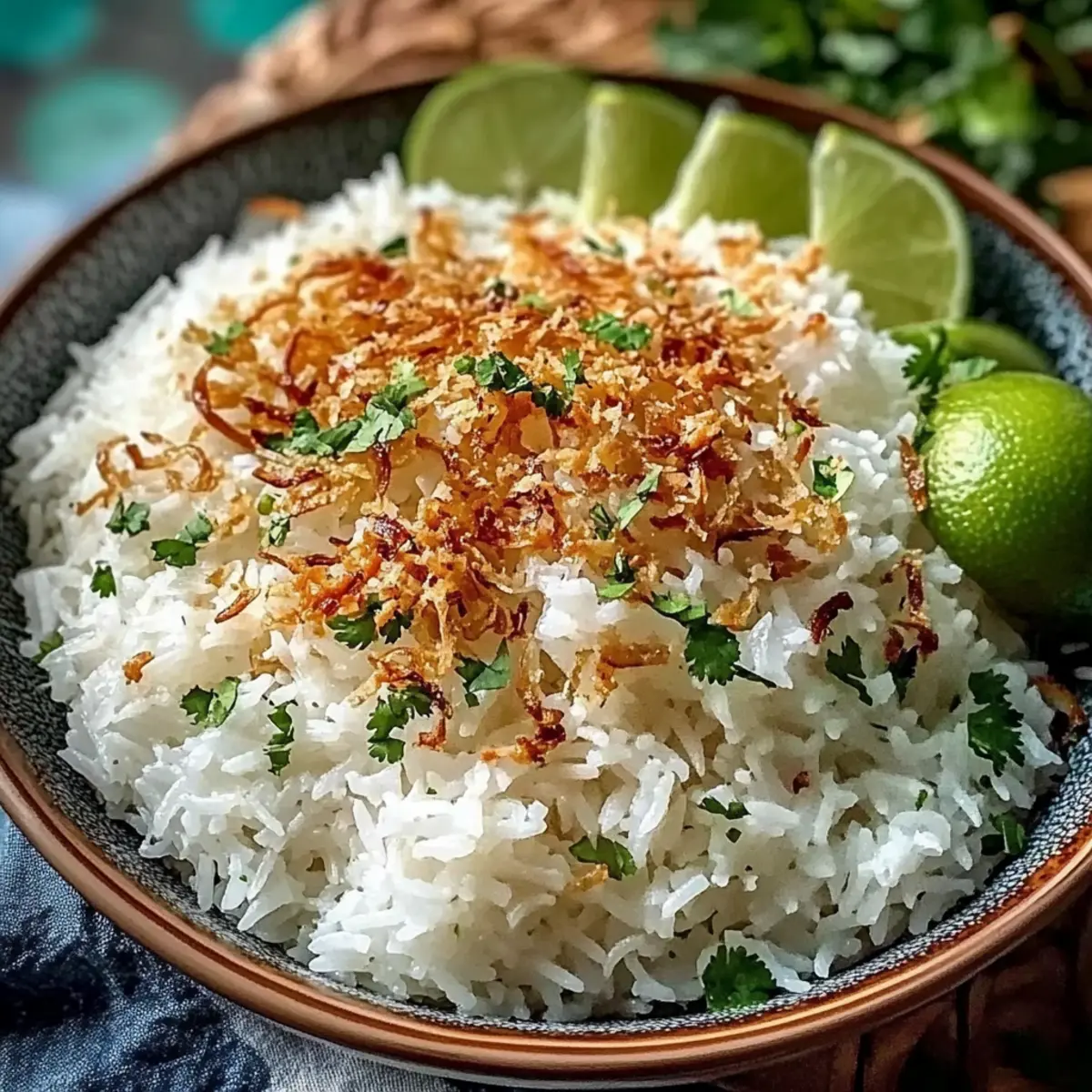 Once resting is complete, remove the lid and gently fluff the rice using a fork. This will help aerate the grains. Transfer the fluffy Thai Coconut Rice to a serving dish, then generously top with crispy fried shallots and freshly chopped cilantro. Finish with lime slices for an extra zest that beautifully complements this delightful dish.
